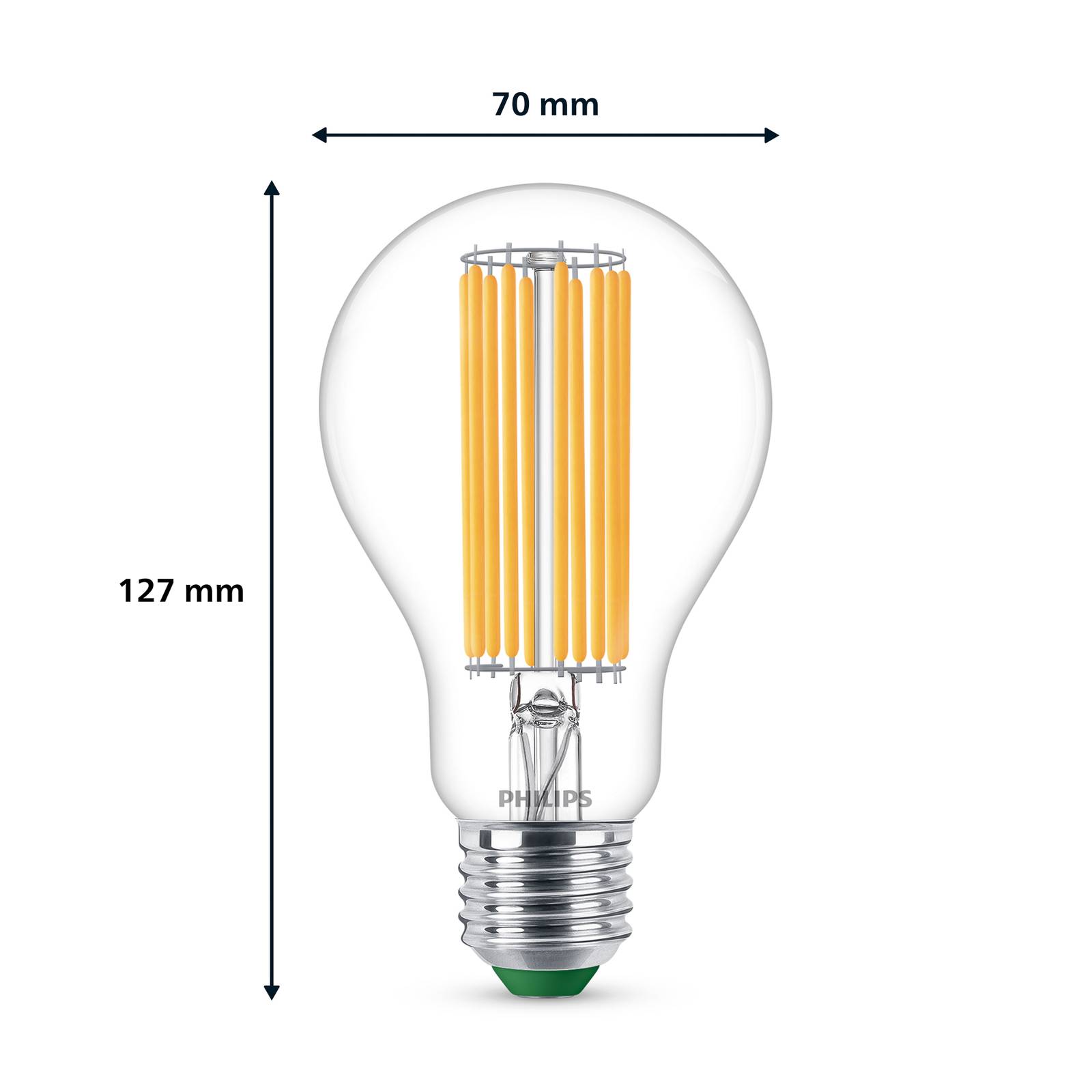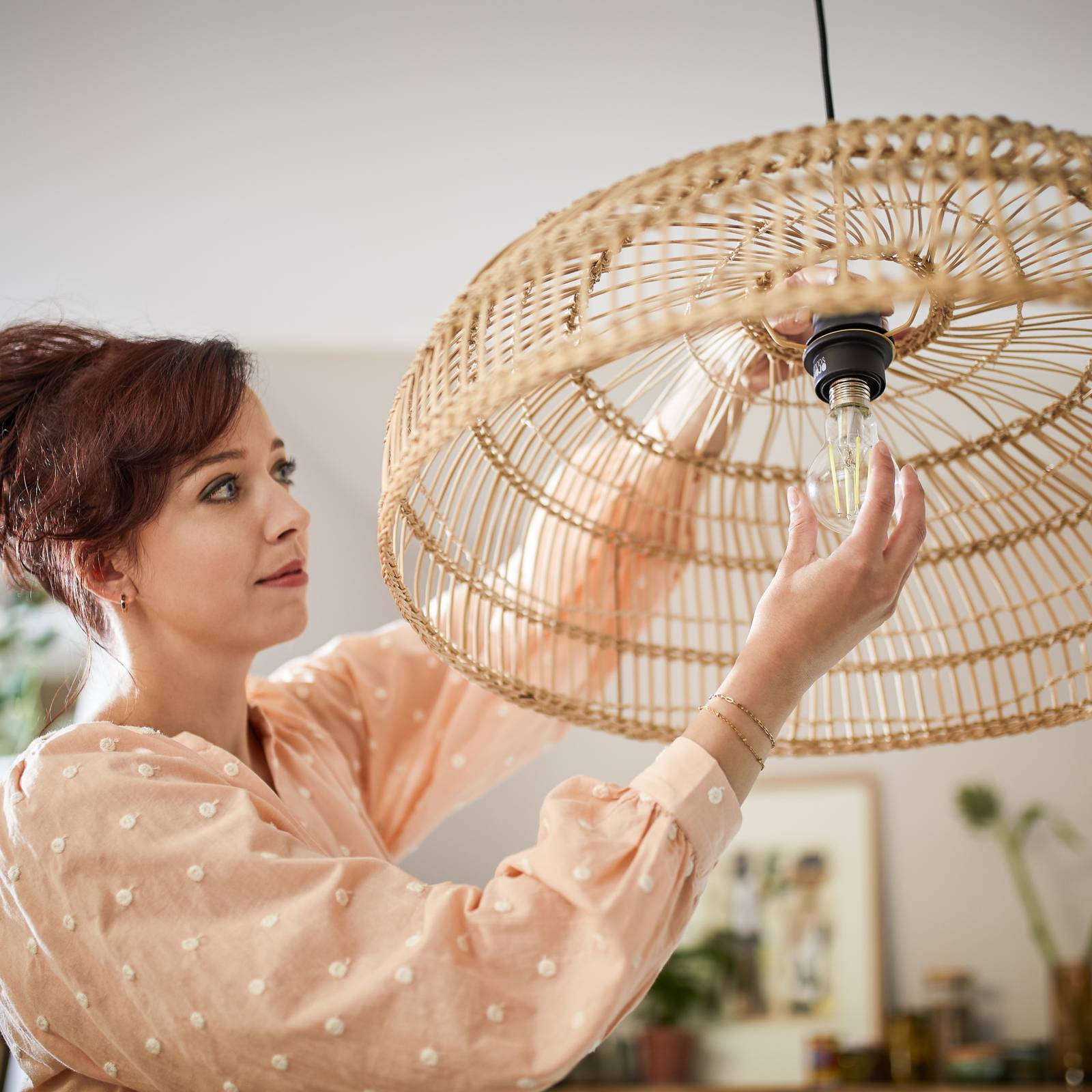 Warmwitte LED filamentlamp E27 – bijzonder efficiënt met 1.095 lm bij 5,2 W Deze E27 lamp doet visueel denken aan conventionele gloeilampen dankzij het heldere glas en de LED filamenten. Tegelijkertijd zorgt de geavanceerde LED-technologie voor een minimaal stroomverbruik. – uitstekend lichtrendement, uiterst zuinig (A-label, Ultra Efficient): tot 60% lager energieverbruik in vergelijking met conventionele LED-lampen – EyeComfort: goede lichtkwaliteit is prettig voor de ogen en ondersteunt het concentratievermogen – Nominale levensduur: 50.000 uur Aantal schakelcycli: 50.000 – Niet dimbaar