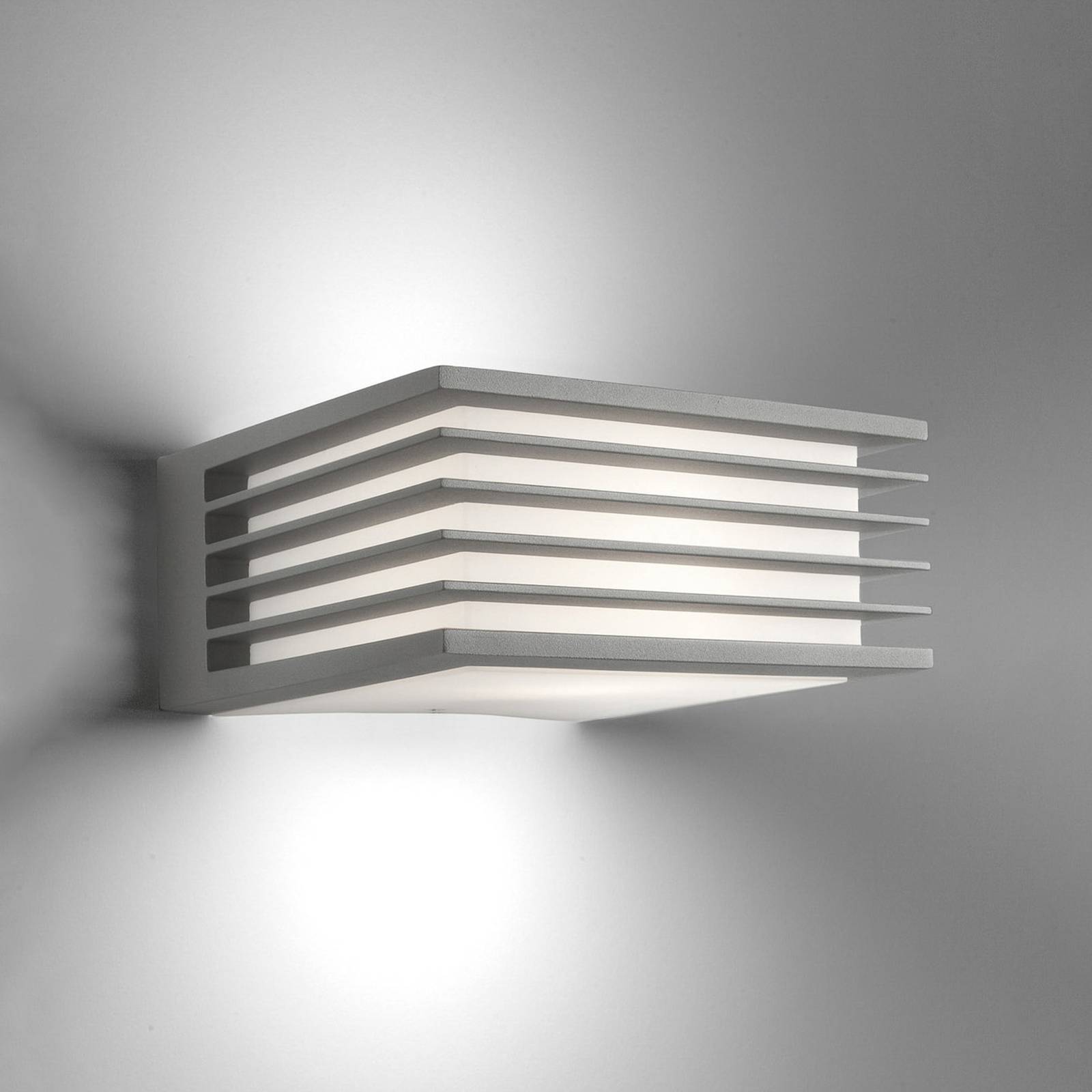 Buitenwandlamp Shade met E27 fitting in grijs Die grijze buitenwandlamp Shade, ontworpen met verblindingsverminderende en beschermende lamellen, is een decoratieve buitenlamp voor ingangen, patio’s en vele andere gebieden. Ze straalt niet-verblindend licht uit dankzij de gesatineerde diffuser en lichtsturende lamellen en kan worden uitgerust met elke Form lamp met E27 fitting.