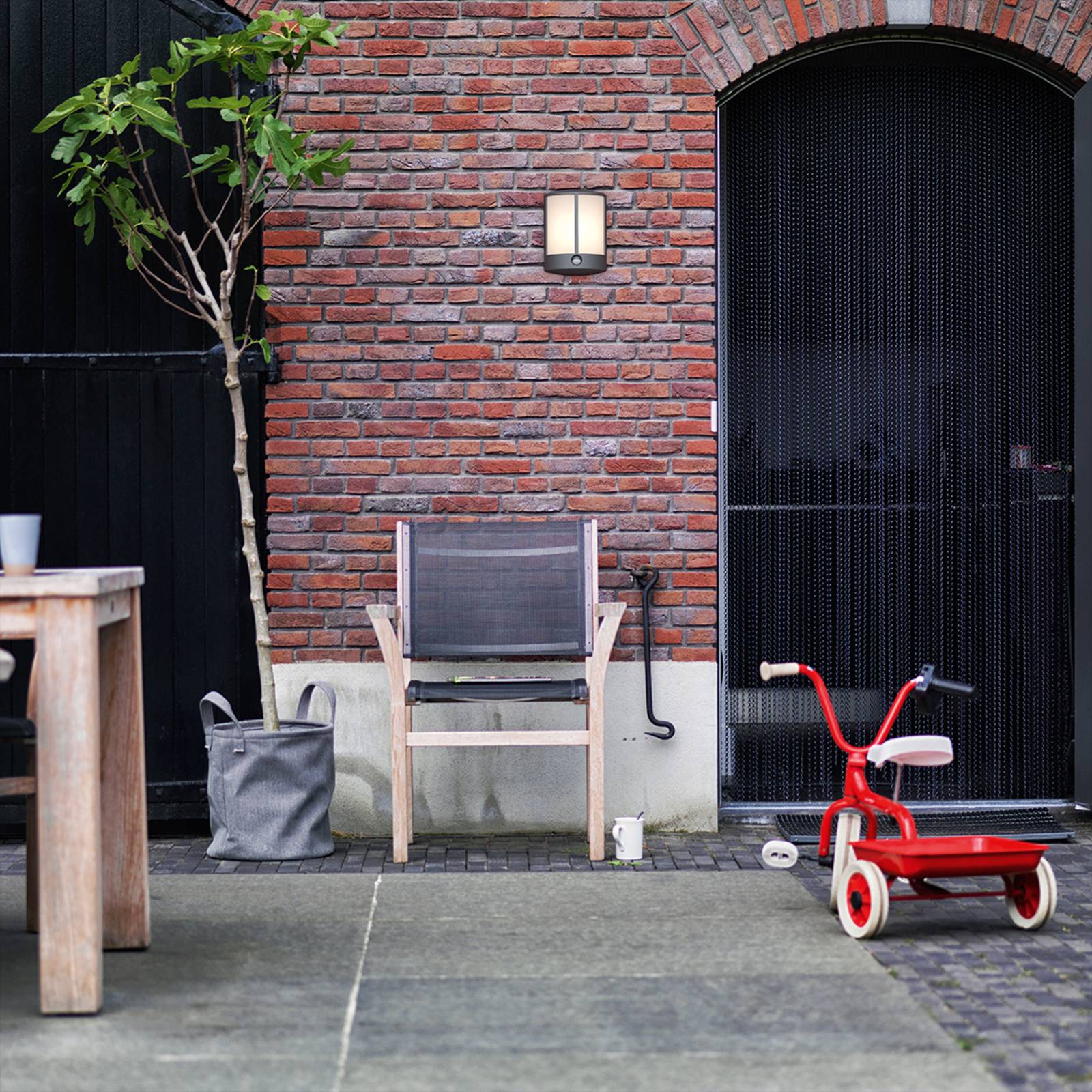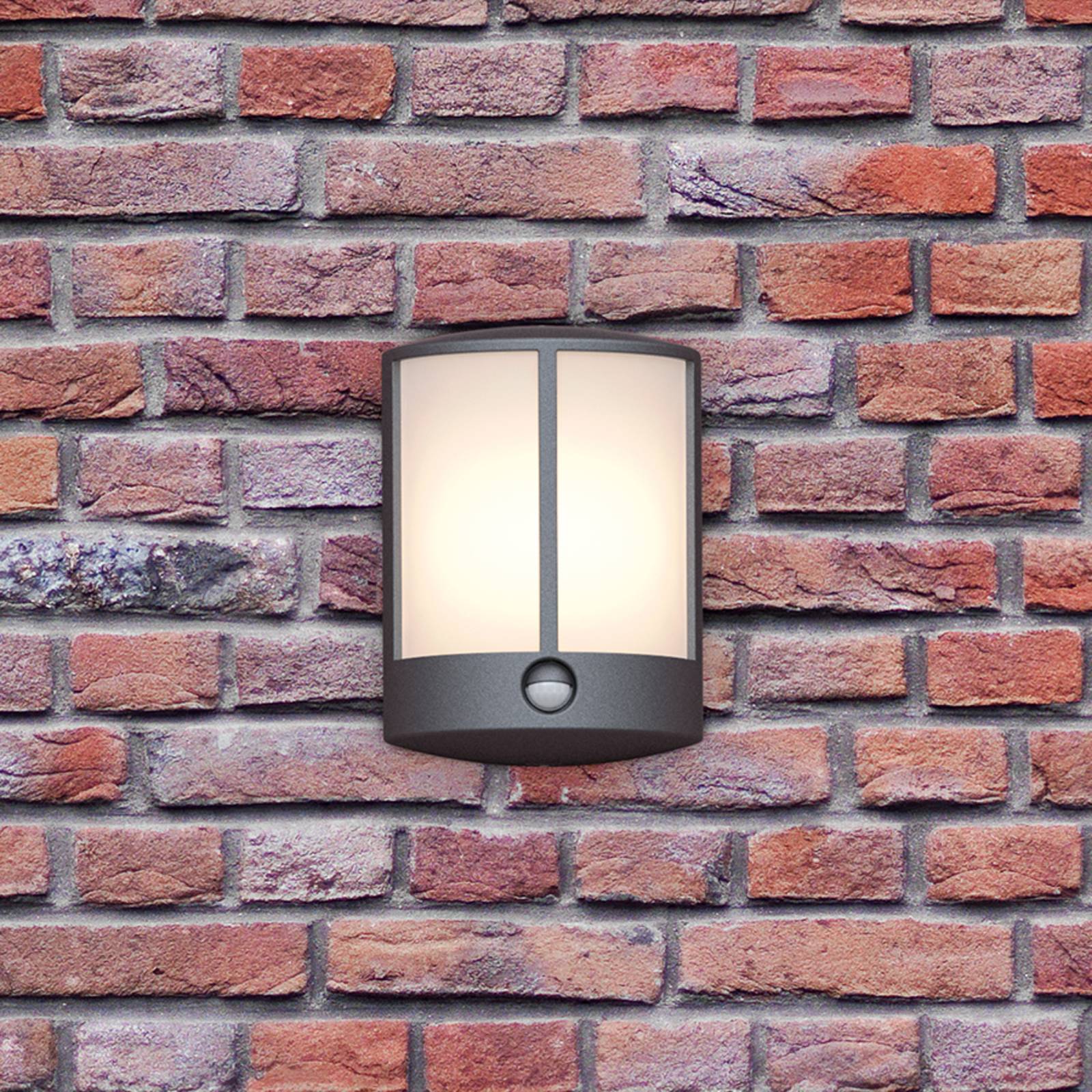 Met bewegingssensor – LED wandlamp Stock met antracietkleurige afwerking Of het nu in de kelder, de schuur of in buitengebied, de LED wandlamp Stock brengt overal licht in het duister. Zonder daarbij moeizaam de schakelaar in de duisternis te moeten zoeken, detecteert de lamp via een geïntegreerde sensor bewegingen op een afstand van 10 meter en schakelt zich bij herkenning automatisch in. Zo wordt op elk moment en overal een veilige en voldoende heldere verlichting gewaarborgd. Warm wit en met ongeveer 600 lumen wordt het LED licht gelijkmatig uit de gesatineerde verdeler uitgestraald. – detectiehoek: 110° – brandtijd instelbaar van 5 seconden tot 12 minuten