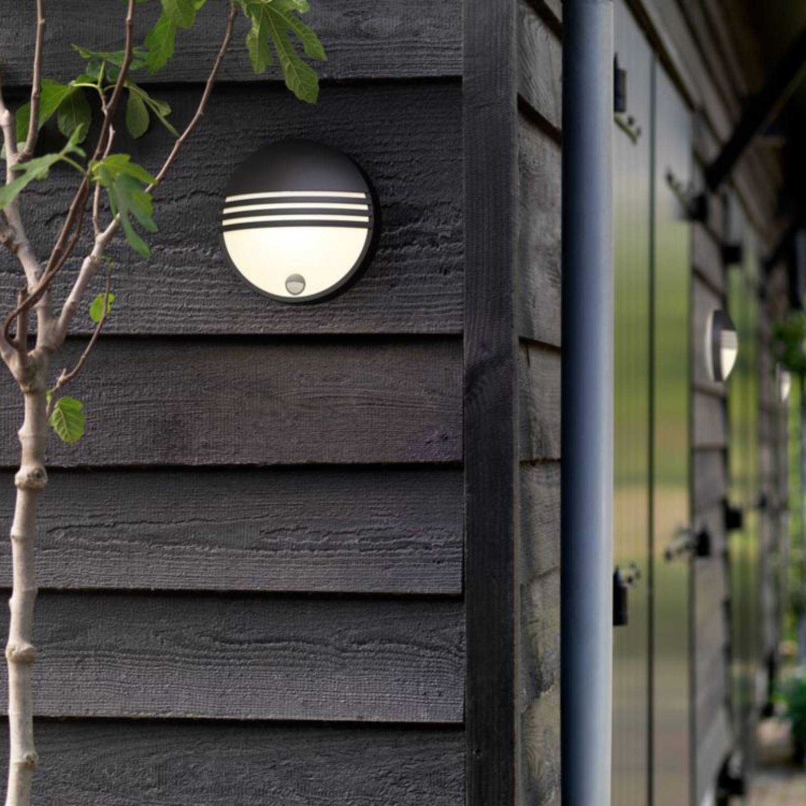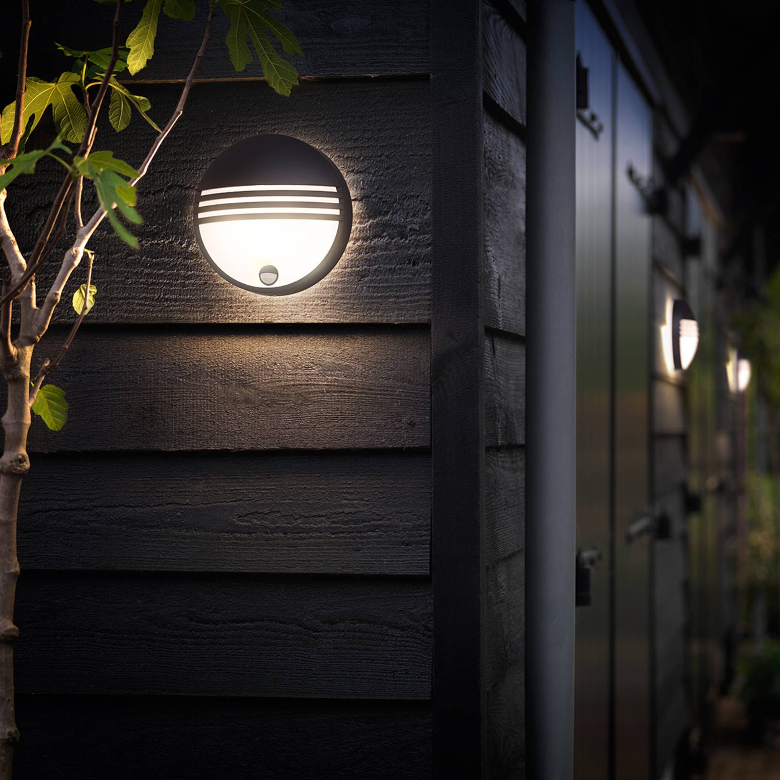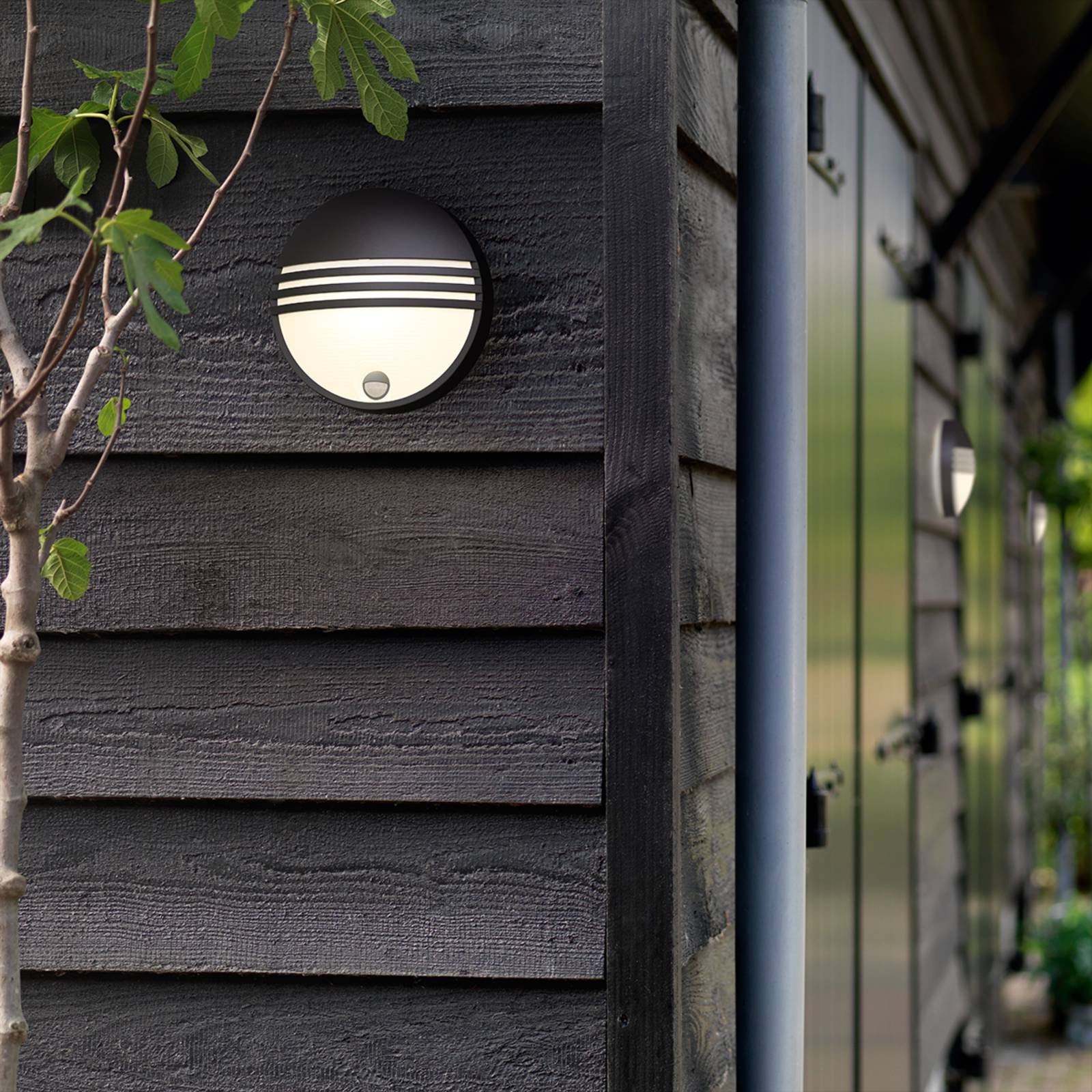 Ultramoderne LED outdoor wandlamp Yarrow met infrarood bewegingsmelder Yarrow is niet alleen een wondermooie lamp met sfeervol LED licht, maar tegelijkertijd ook uitgesproken comfortabel. Zo neemt de geïntegreerde bewegingsmelder reeds van op een afstand tot 10 meter bewegingen waar en schakelt ze automatisch het licht in. Zo wordt juist in de donkerste tijd van het jaar de weg naar het huis betrouwbaar en veilig verlicht. Door de drie strepen, die de wit gesatineerde verdeler sieren, ontstaat aanvullend een toffe look, die door het ronde, koepelvormige, lampenframe wonderbaarlijk vervolledigd wordt. Yarrow is een lamp van de merkfabrikant Philips. – Stralingshoek bewegingsmelder: 110 ° – lichtduur: 5 sec. – 12 min.