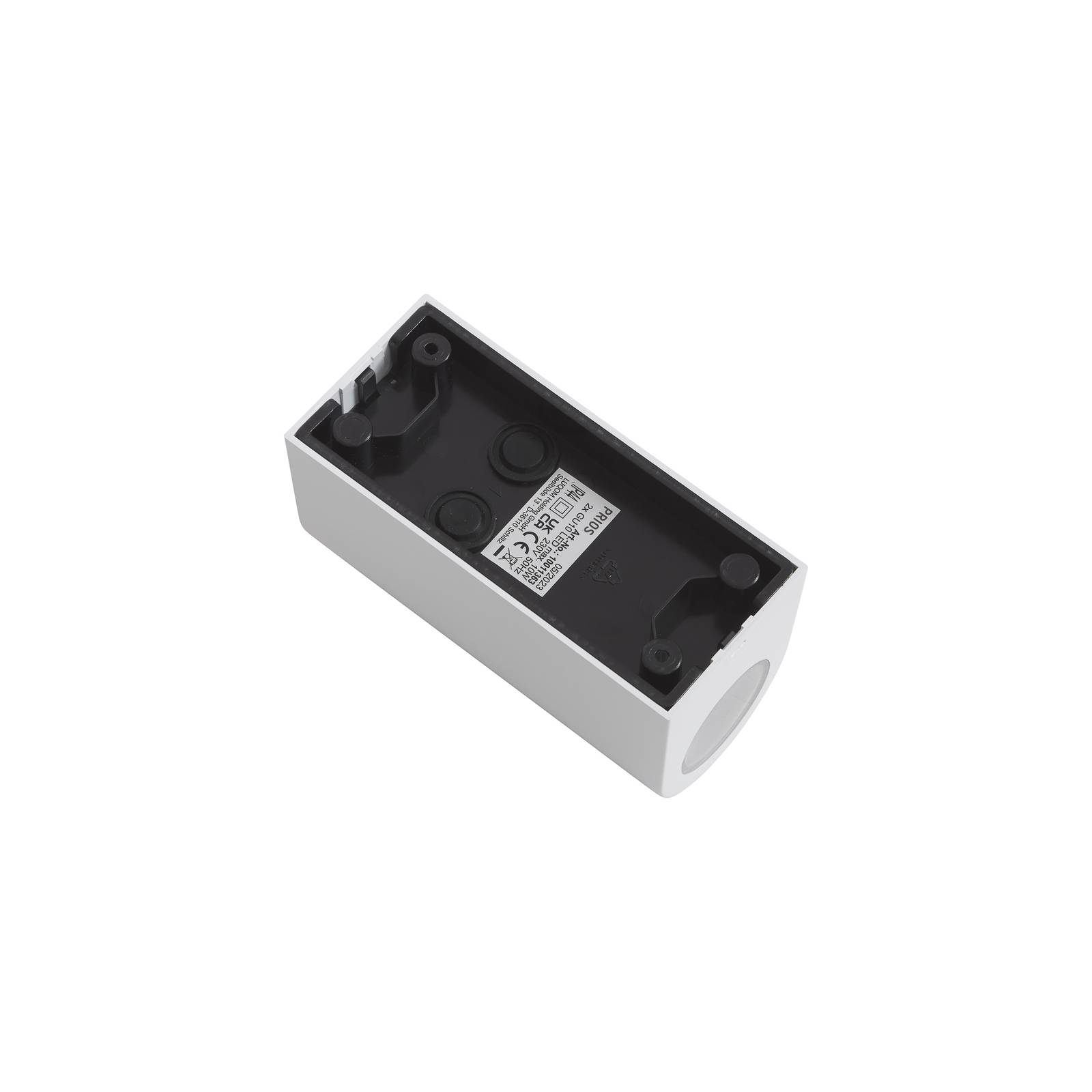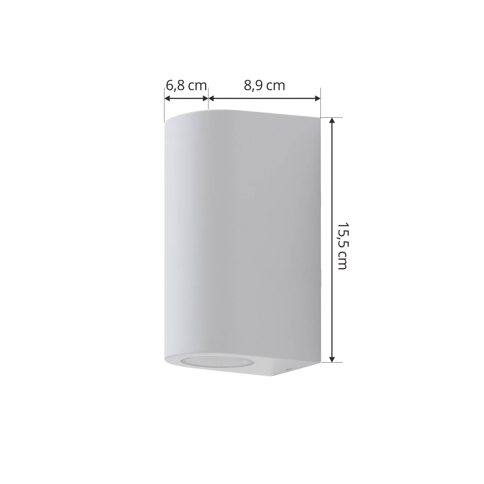 Tweelamps buitenwandlamp Irfan in wit designIrfan is perfect geschikt voor de verlichting van een terras en overtuigt door haar vrij onopvallende vormgeving. De buitenwandlamp is gemaakt van kunststof en heeft een afgeronde vorm. Hij kan worden uitgerust met twee GU10 lampen, waarvan het licht uit de boven- en onderkant van de behuizing komt. De beschermingsgraad IP44 geeft aan dat Irfan beschermd is tegen spatwater. Het eenvoudige ontwerp van de armatuur integreert goed in de bouwstijl van een huis zonder deze te doorbreken.