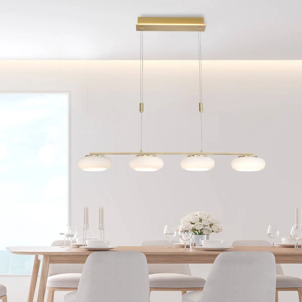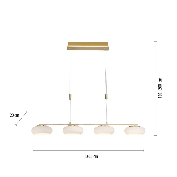 LED-hanglamp met vier vlammen Q-ETIENNE met CCT en dimfunctieDe LED-hanglamp Q-ETIENNE wordt met een kubusvormige kap aan het plafond bevestigd. Er hangt een smalle stang aan, waaraan vier ovale glazen kappen zijn bevestigd. Het is mogelijk de hoogte van de armatuur te variëren via kabeltrekkers. Bij de levering is ook een afstandsbediening inbegrepen waarmee de hanglamp kan worden gedimd en de lichtkleur kan worden veranderd van warm naar universeel wit. Bovendien kunnen verschillende lichtscènes worden geselecteerd en kan de geheugenfunctie worden gebruikt. Q-ETIENNE is ZigBee-compatibel, wat betekent dat de lamp kan worden geïntegreerd in een compatibel smart home-systeem. Hij kan dan ook via app of spraakbesturing worden bediend.Technische gegevens/compatibiliteit:- dimbaar- hoogte instelbaar van 120 tot 200 cm- lichttemperatuur instelbaar van warm wit tot universeel wit- geheugenfunctie- schakelen van maximaal 20 individuele Q-lampen of Q-lampen naar max. 3 groepen met slechts één Q-afstandsbediening- ZigBee- te bedienen met de afstandsbediening- spraakbesturing via Echo (4.. Bij integratie in een op ZigBee gebaseerd smart home systeem, kan het ook gemakkelijk worden bediend via app of spraakopdrachtNoot: Voor integratie in een smart home systeem of app-bediening is een bridge nodig; deze maakt geen deel uit van de levering