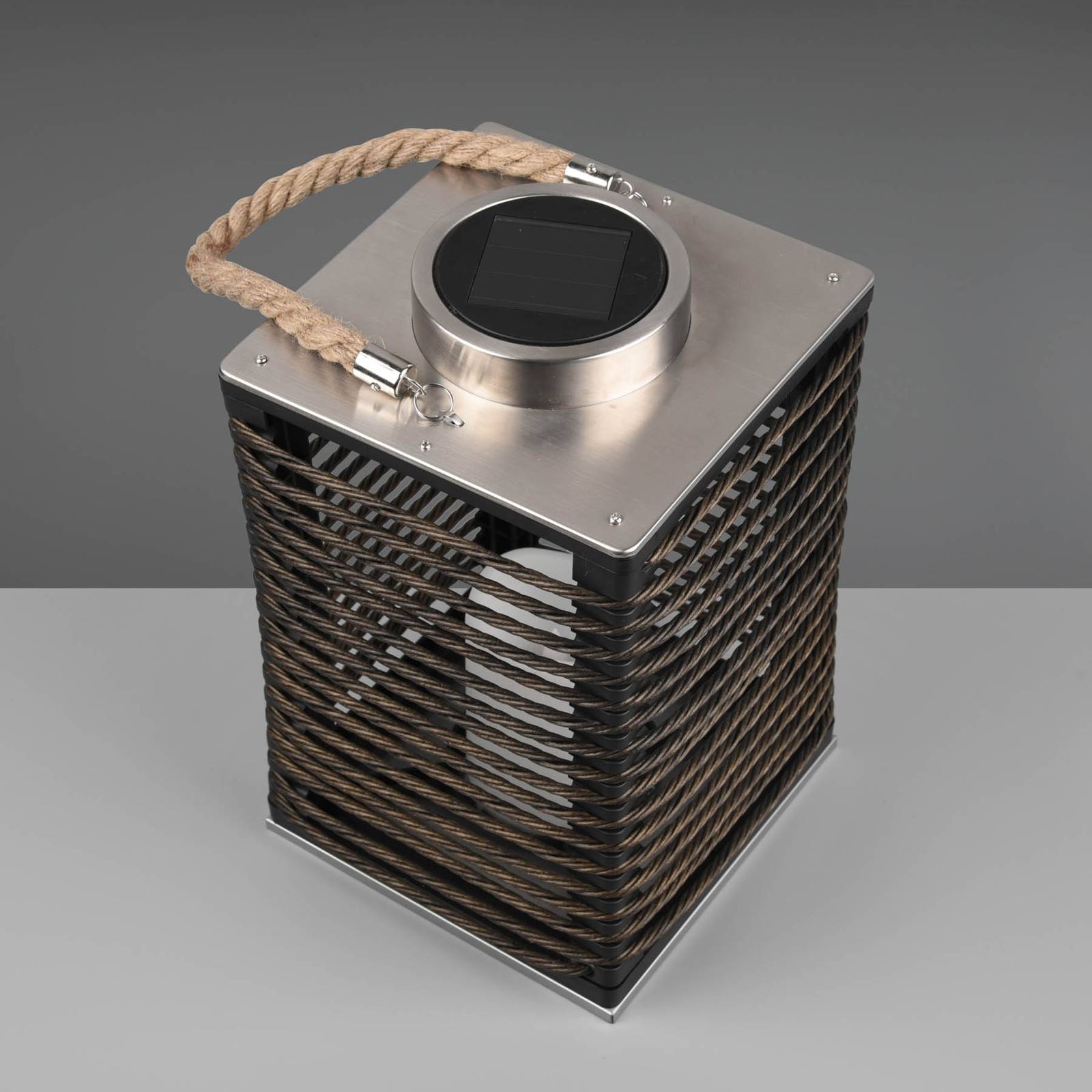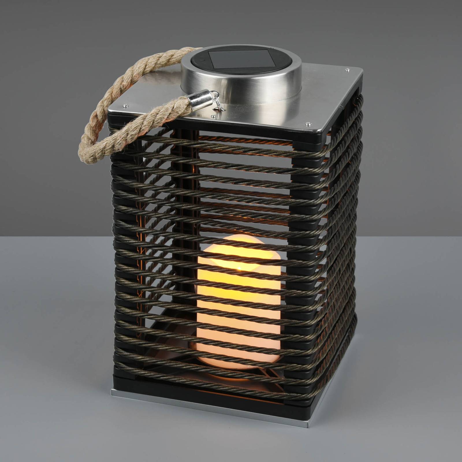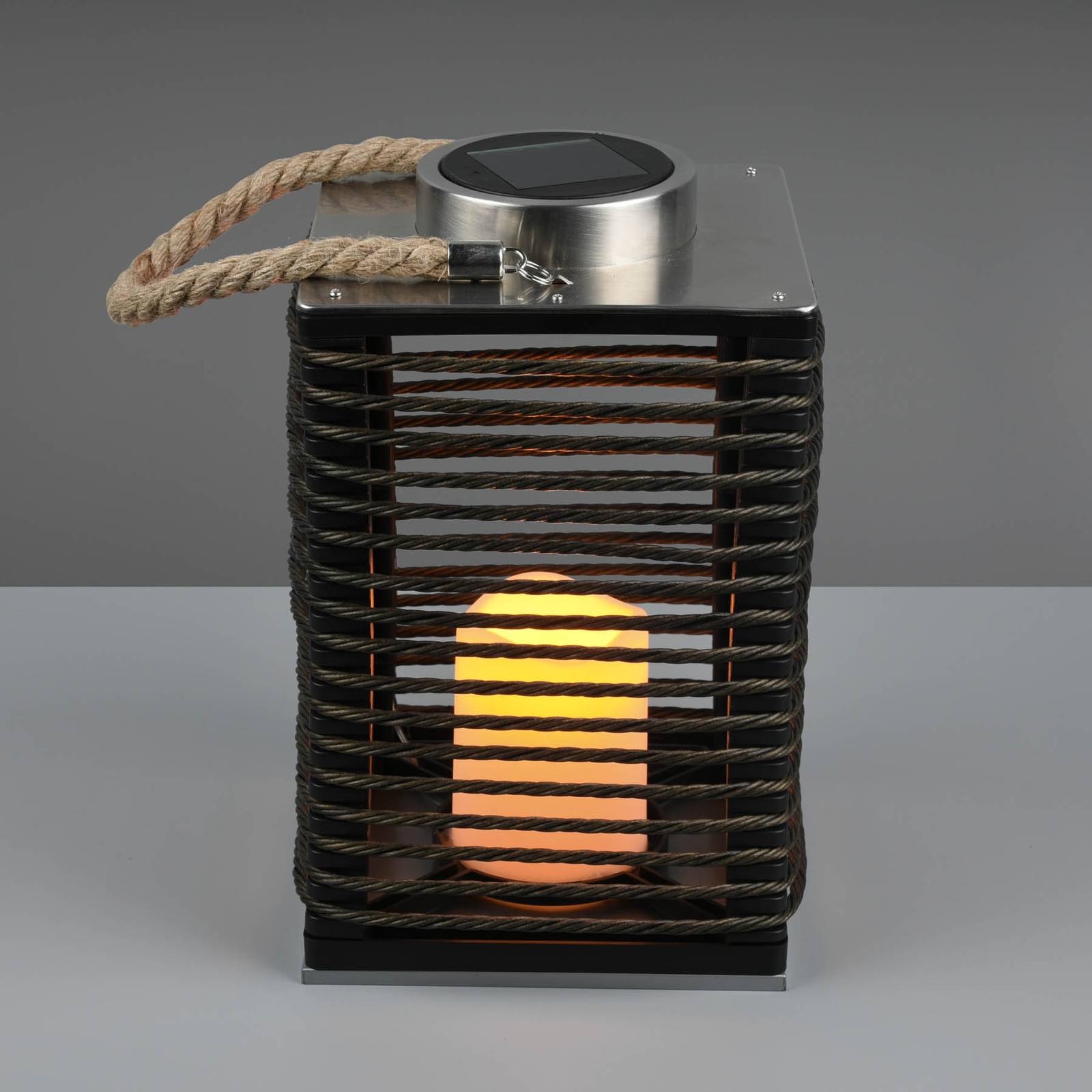 LED decoratieve buitenlamp Santana met zonnepaneel en vlameffect De LED solarlamp Santana is ontworpen als een draagbare lantaarn. In de kubusvormige kooi van zwart plastic zit een decoratieve kaars met geïntegreerde LED die een sfeervol vlameffect creëert. Het zonnepaneel is aan de bovenkant geïntegreerd en voedt de batterij van de lamp – een externe stroomaansluiting is dus niet nodig. Santana heeft een schakelaar voor handmatige bediening en ook een daglichtsensor die het licht automatisch activeert in het donker. Het natuurlijk bruine touw nodigt uit om de decoratieve lamp steeds van positie te veranderen en maakt het ook mogelijk om hem op te hangen.