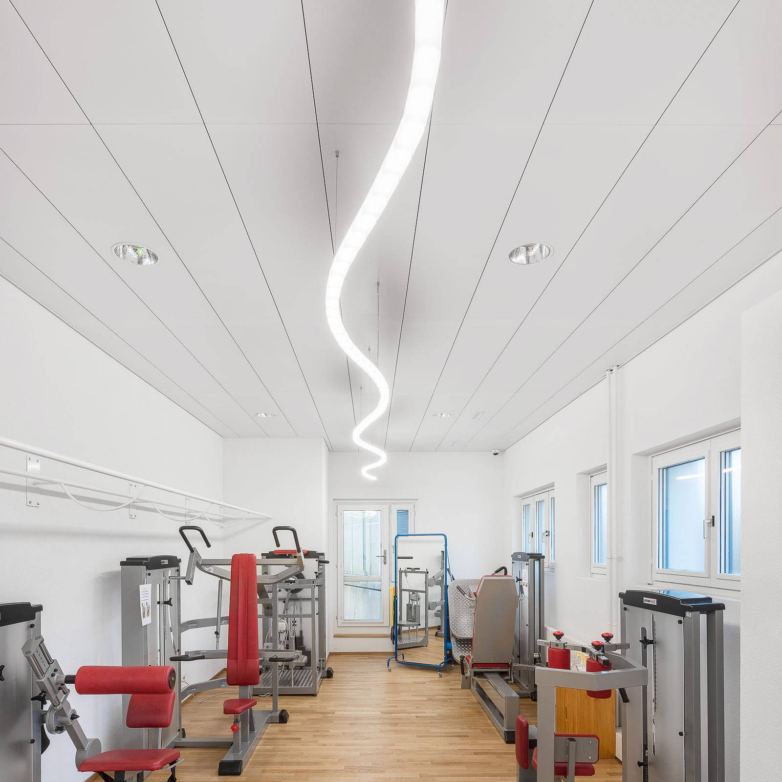 Flexibel in vorm: LED opbouw plafondlamp Wiggle Met deze lichtstrip, die zowel aan het plafond als aan de wand kan worden gemonteerd, kan elke ruimte effectief en tegelijkertijd gevarieerd worden verlicht. Het bijzondere aan Wiggle is dat het bestaat uit elementen die tegen elkaar kunnen worden gedraaid en gemonteerd om ofwel een rechte lijn ofwel vloeiende bochten te creëren. Het licht wordt rechtstreeks in de kamer uitgestraald. De vereiste, extern DALI-dimbare voorschakelapparatuur is reeds bij de levering inbegrepen. Gebruik als pendelarmatuur is mogelijk met een apart verkrijgbare ophangset (zie accessoires). – zes montagepunten, zes montagebeugels – Slagvastheid: IK08