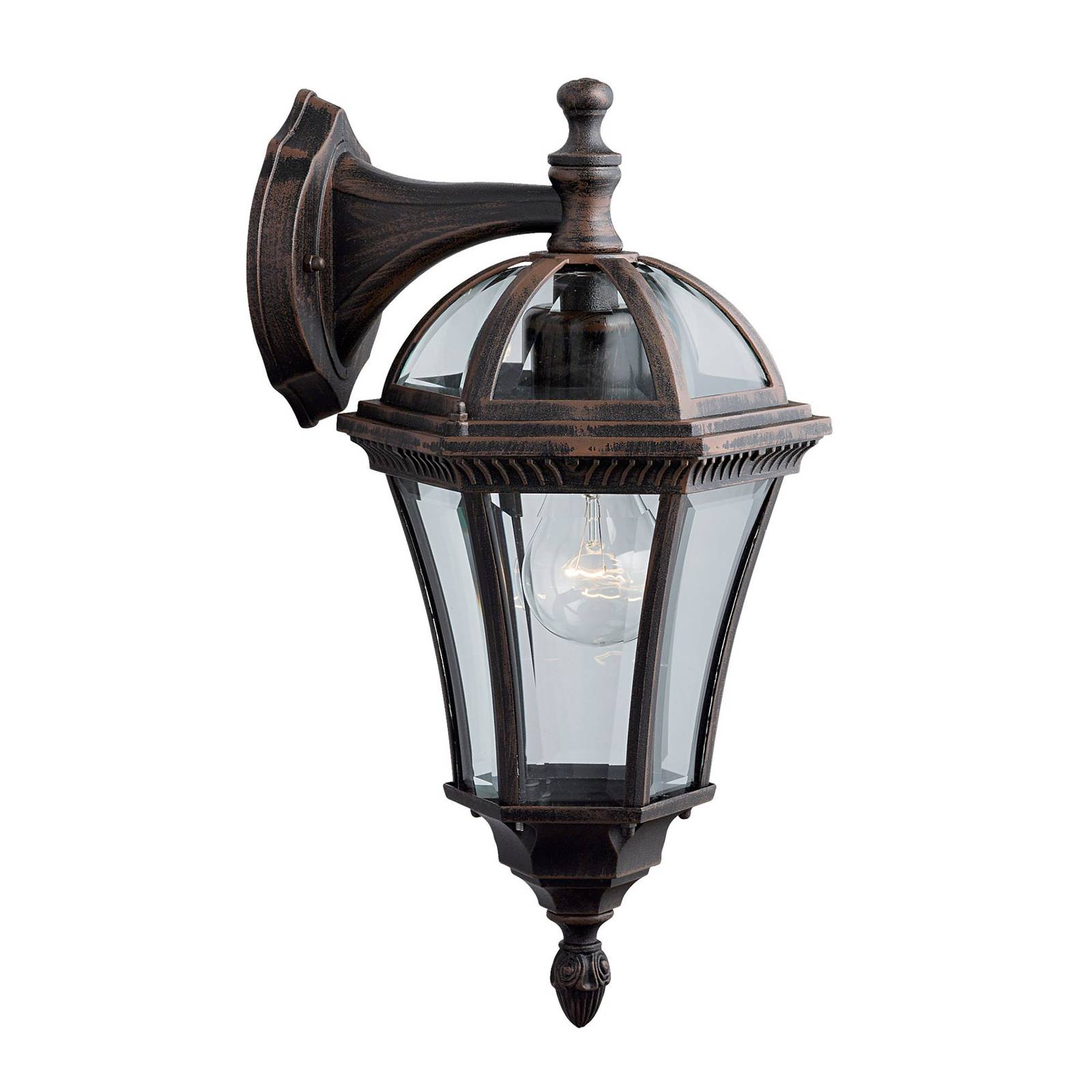 Capri buitenwandlamp met naar beneden gerichte lantaarn De Capri buitenwandlamp is met beschermingsklasse IP44 beschermd tegen het binnendringen van spatwater en kan overal buiten worden gebruikt als gevelverlichting, bijvoorbeeld als huisentreeverlichting of als lichtbron op het terras of balkon. Het is gemaakt van duurzaam aluminium met een rustieke bruine afwerking, het antieke ontwerp past perfect bij rustieke of antieke woningontwerpen. De lamp biedt rondom heldere omgevingsverlichting dankzij het heldere glas.