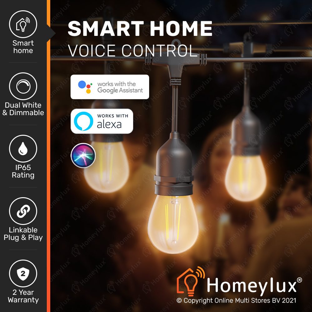 Deze vijf meter LED string light is voorzien van tien stuks E27 fittingen inclusief 10 smart filament A60 LED lampen. De LED filament lampen kunnen aangenaam worden omruilen door een andere lichtbron met E27 fitting. Zo bepaal je zelf de lichtkleur van de vijf meter LED lichtsnoer en is deze mede nog dimbaar via de Homeylux app.