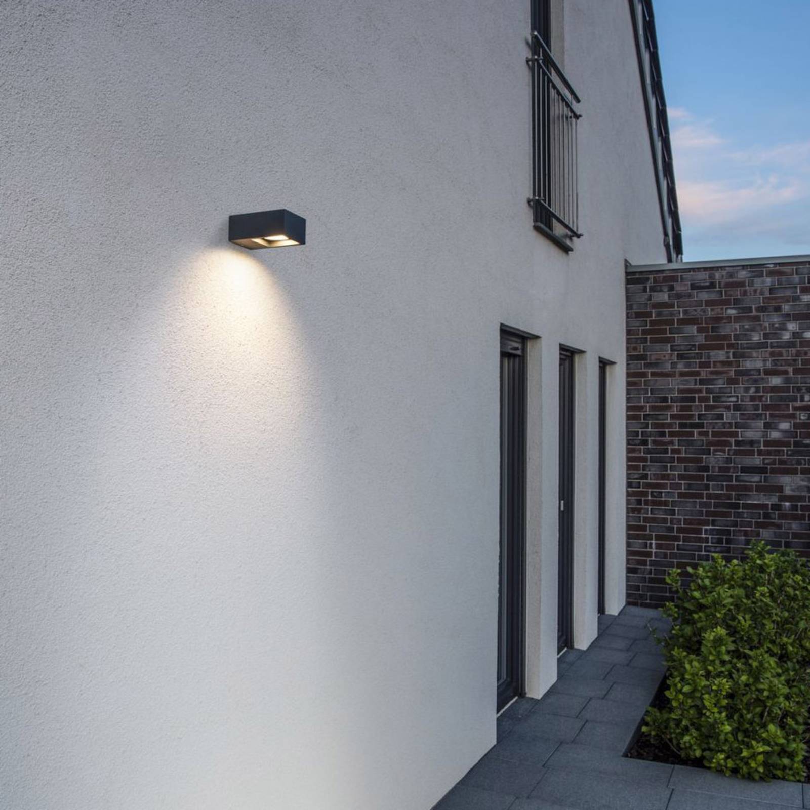 Dimbare Eskina Frame LED buitenwandlamp met draaibare LED-lichtunit en CCT-functie Deze LED buitenwandlamp draagt niet voor niets de naam “Eskina Frame”, want het antracietkleurige aluminium frame omlijst de centraal geplaatste LED-lichtunit. Deze kan 360 graden worden gedraaid zodat de lichtkegel naar boven of beneden kan worden gericht. In combinatie met de kleine schakelaar, waarmee het LED licht tijdens de installatie van warmwit naar universeel wit kan worden geschakeld, kunnen individuele verlichtingsconcepten worden ontwikkeld en geïmplementeerd. Das kan ook via de huisinstallatie worden gedimd, zodat er geen grenzen zijn aan het oproepen van een speciale sfeer – incl. CCT-functie: 1.100/1.200 lm, 3.000/4.000 K – dimbaar