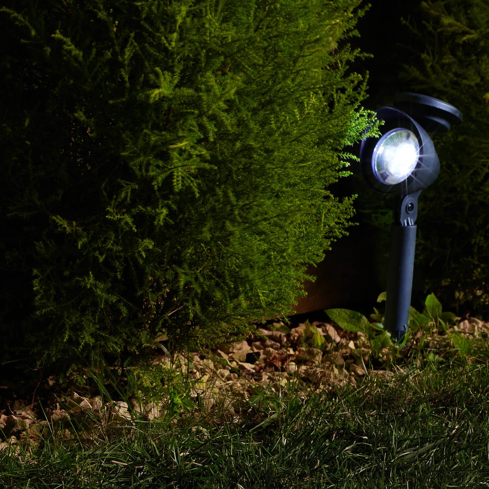 Variabele LED grondspiesspot Prima op zonne-energie in een praktische set van 4 De LED grondspiesspot Prima op zonne-energie, geleverd in een set van 4, is uitgerust met een LED en een variabel uit te richten armatuurkop, zodat hij bepaalde zones of objecten buiten gericht kan verlichten en in scène zetten. Dankzij de geïntegreerde schemersensor schakelt het licht automatisch in als het donker wordt. – lichtduur tot 6 uur – incl. schemersensor – spot variabel richtbaar