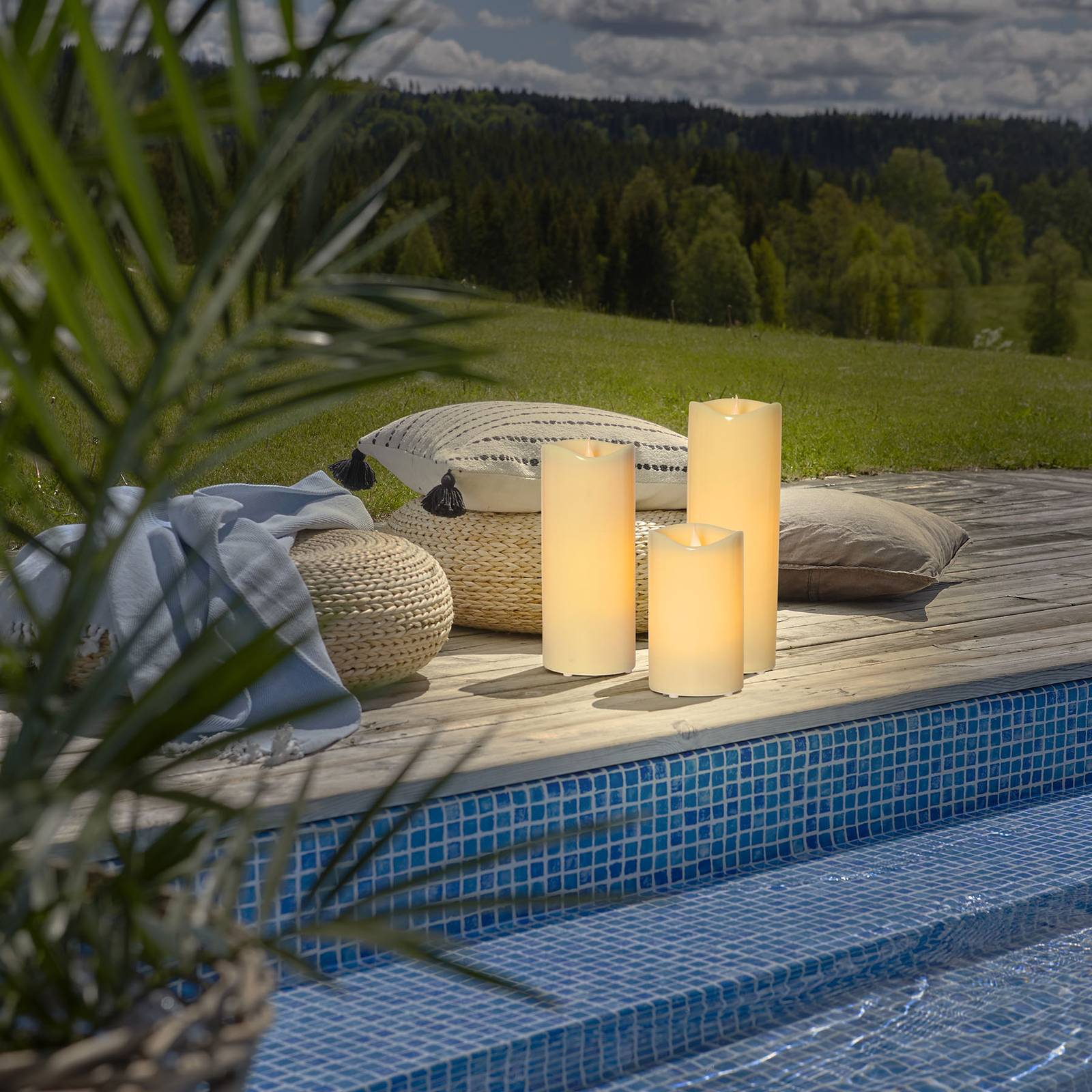 Beige LED kaars Grande, op batterijen, voor buitengebruik De LED-kaars Grande begeleidt vakkundig de avonduren op het balkon of terras. De beige kleurige kaars is bedoeld voor buitengebruik en kan daar op een absoluut flexibele manier worden geplaatst. De ingebouwde LED’s zorgen voor warm wit, flikkerend licht. Dankzij een geïntegreerde timer kan via de schakelaar ofwel continu licht worden geselecteerd ofwel kan een 6-uurstimer worden geactiveerd, die het licht vervolgens 18 uur lang uitschakelt en dan weer start. Natuurlijk kan de kaars ook worden uitgeschakeld via de schakelaar. Vooral in combinatie met andere kaarsen kan een sfeervolle ambiance worden opgeroepen. De lamp wordt gevoed door drie C-batterijen (niet inbegrepen – zie accessoires).