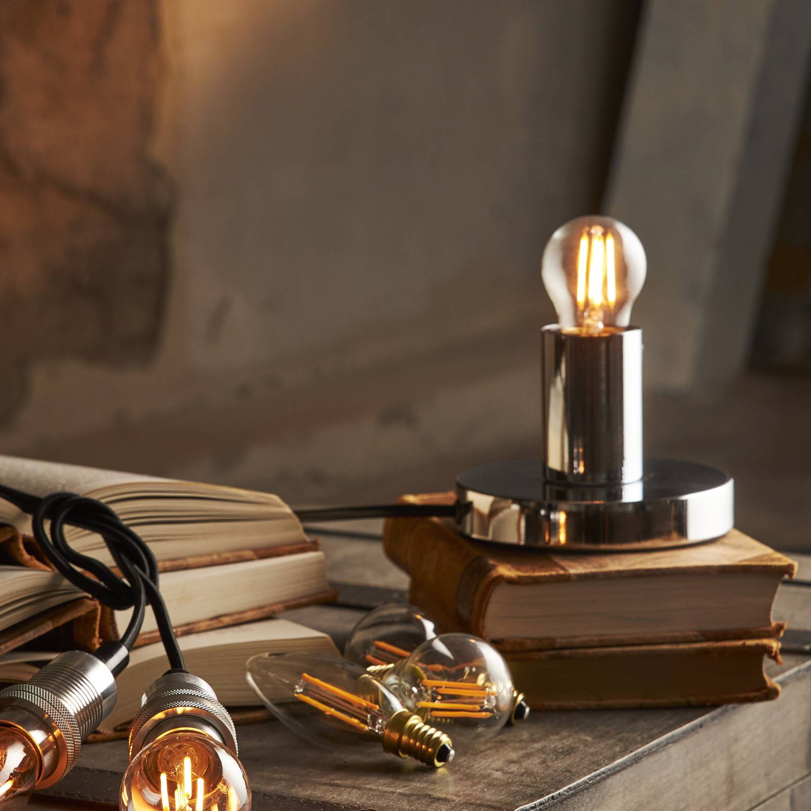 E14 LED lamp in druppelvorm Filament, 4 Watt, 2.100K met 3-staps dimfunctieDeze E14 LED druppellamp straalt rondom een zeer warm licht uit. De gloeidraden zijn zichtbaar door het heldere glas, zodat het bijzonder effectief is in open vormgegeven armaturen. De 3-staps dimfunctie maakt het mogelijk de lichtsterkte te wijzigen via conventionele wandschakelaars. Zo kan de intensiteit in drie stappen worden geregeld (40 lumen, 200 lumen, 400 lumen).Eigenschappen:- zeer warme lichtkleur 2.100 K- dimbaar in drie stappen via de lichtschakelaar