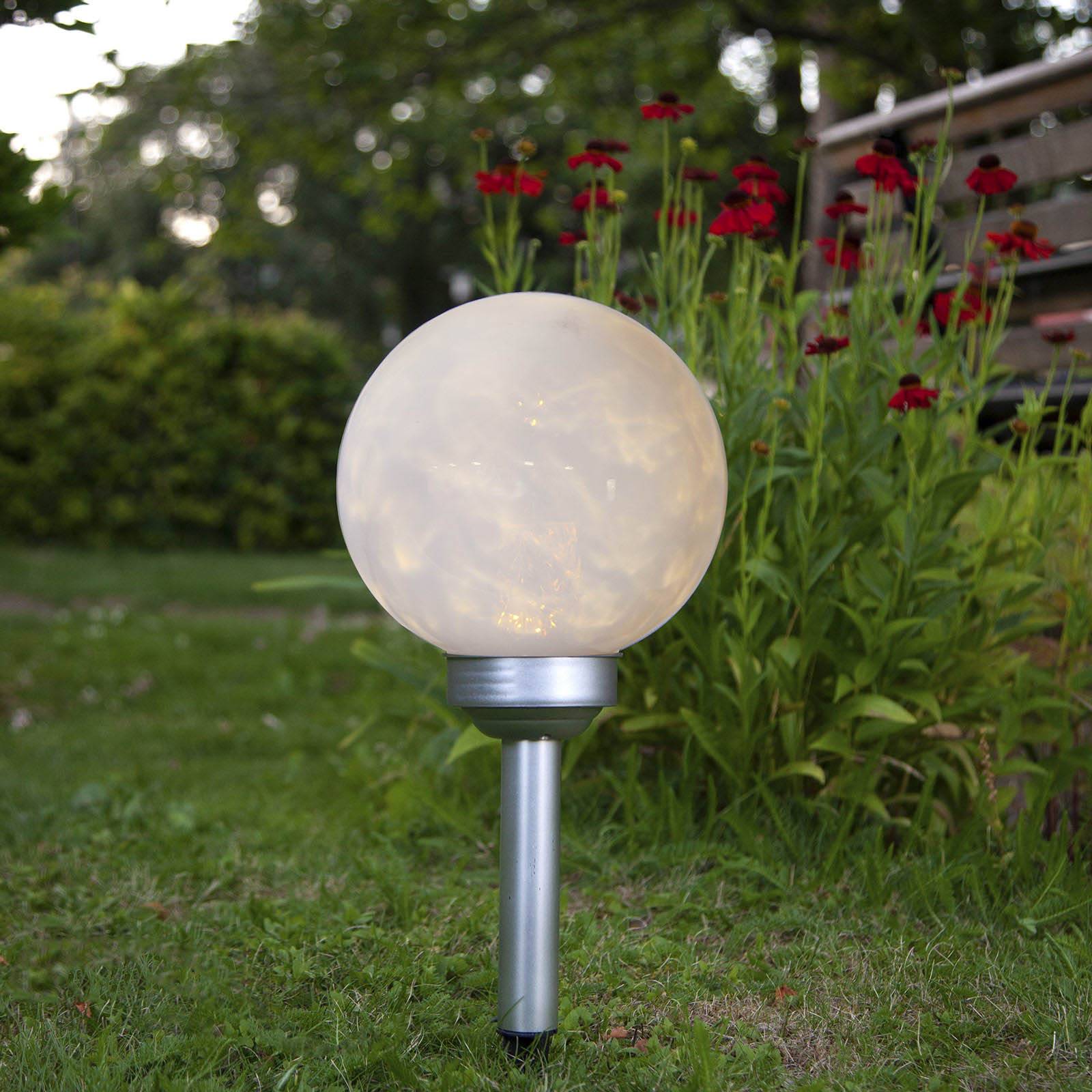 Bolvormige LED-zonnelamp Lunay met glinsterend lichteffect De LED-zonnelamp Lunay bestaat uit een grondspies waarop een uitstekende, witte lampenkap zit. Een kabel verbindt de lamp met een andere aardingspin die de zonnemodule draagt. De geïntegreerde batterij kan de lamp tot zes uur van energie voorzien als deze volledig is opgeladen. In de lampenkap zijn de LED’s zo geïnstalleerd dat ze ofwel een constant, constant licht geven, ofwel draaien en zo een glinsterend lichteffect creëren. Het spel van schaduwen op de lampenkap doet denken aan het onregelmatige oppervlak van de maan.