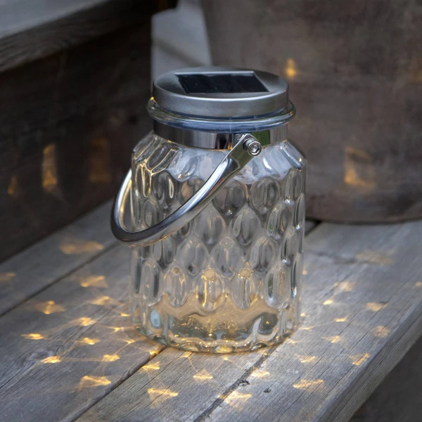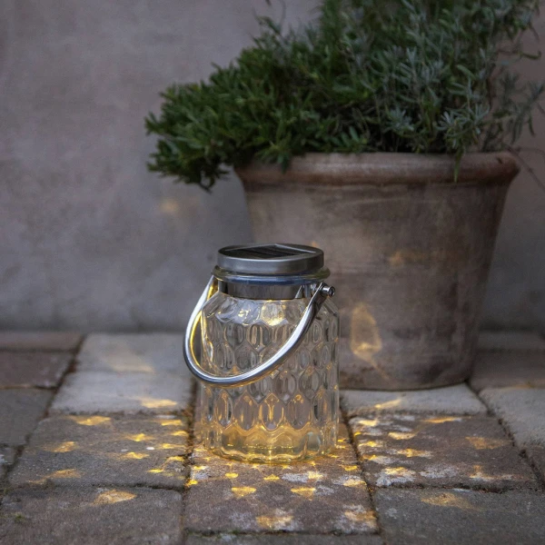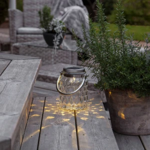 Het transparante glas met het decoratieve bellenpatroon kenmerkt het uiterlijk van de LED-zonnelamp Pireus. De decoratieve lamp heeft een draaggreep en wordt aangedreven door zonne-energie. Daarom kan het flexibel in de buitenruimte worden geplaatst. Het zonnepaneel bevindt zich aan de bovenkant van de lamp. Het bellenpatroon zorgt voor prachtige lichteffecten op de betreffende plaats. – incl. schemersensor – lichtduur ca. 6 uur