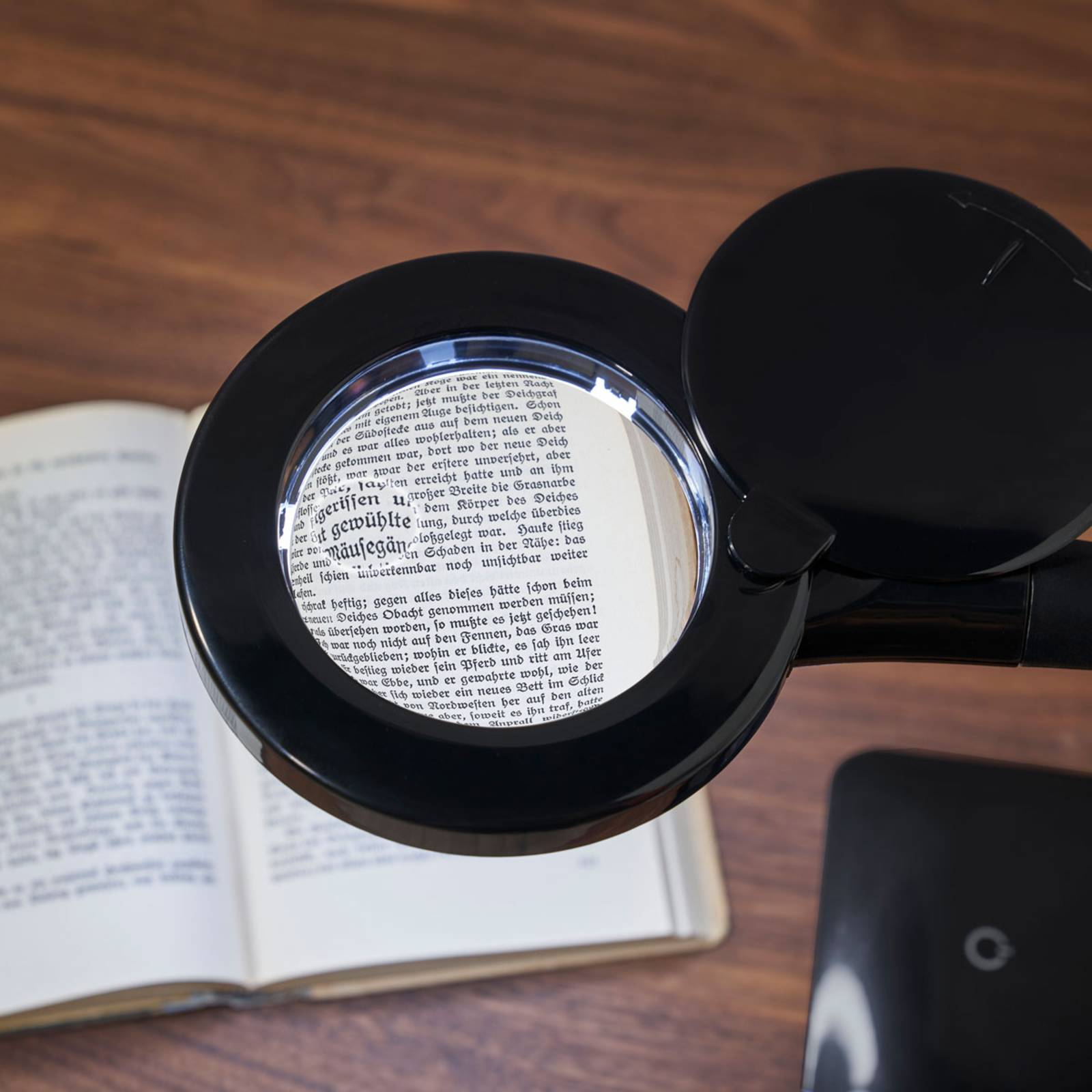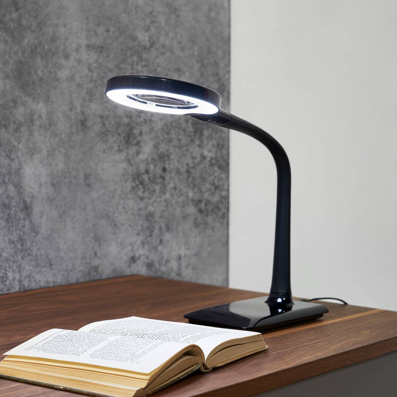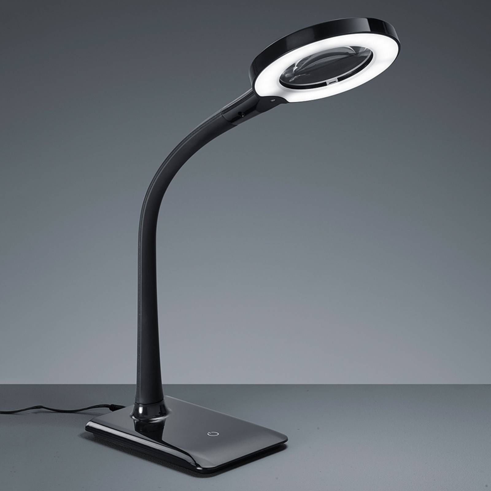 LED-loeplamp Lupo met 4-voudige touch – zwart Met deze praktische, verstelbare loeplamp wordt moeilijk werk bijna kinderspel: Lupo is uitgerust met heldere LED-verlichting die het vergrotingseffect met universeel wit licht uitstekend ondersteunt. Bovendien is er een ingebouwde aanraakschakelaar waarmee de lamp niet alleen kan worden in- en uitgeschakeld, maar waarmee ook de helderheid op vier verschillende manieren kan worden ingesteld (25 %, 50 %, 75 % en 100 %). Het vergrootglas heeft een drievoudige vergroting, en de lamp kan flexibel worden ingesteld.