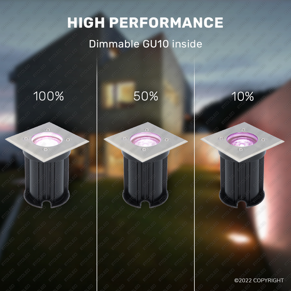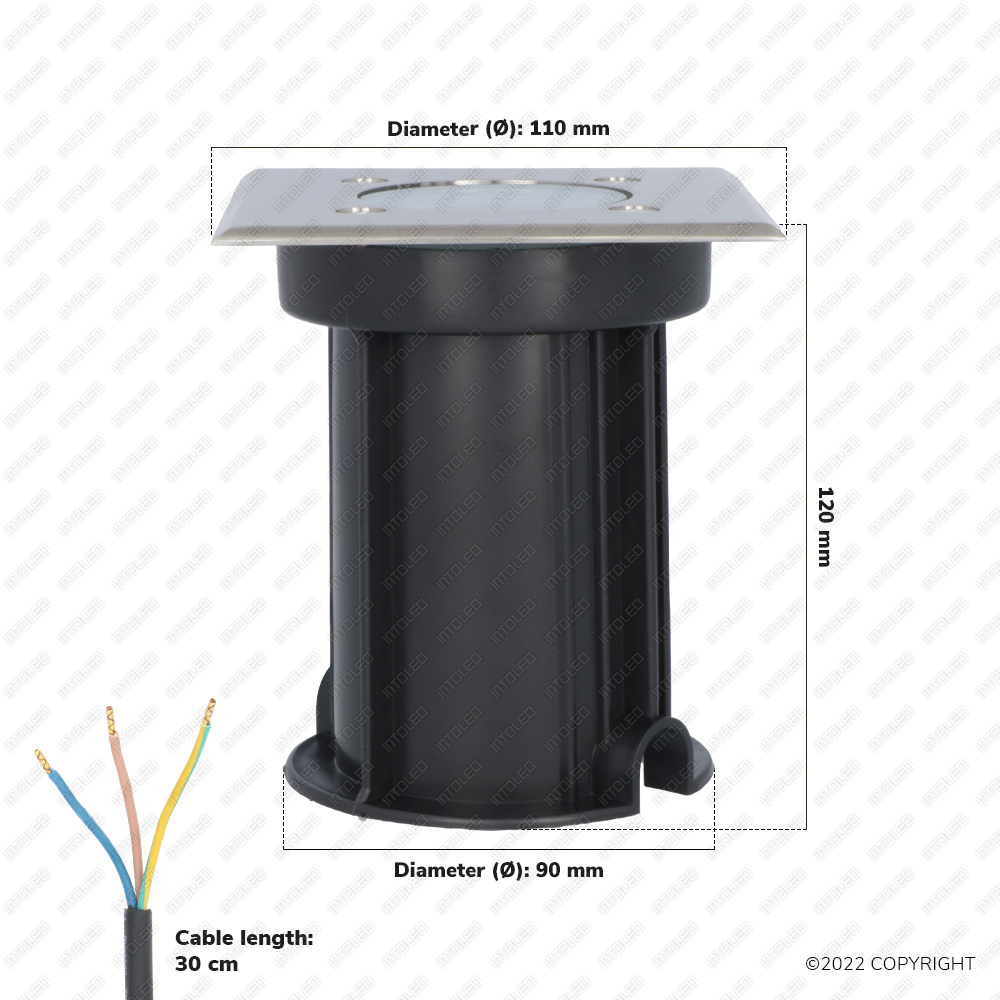 Heb je weinig ervaring met het installeren van verlichting of grondspots? Dan hoef je je geen zorgen te maken: de montage is heel simpelweg. De spot is al voorzien van een GU10 fitting en is reeds aangesloten op een kabel van 30 cm lang. De spot zelf heeft een dimensies van 120x120xØ90x110mm.