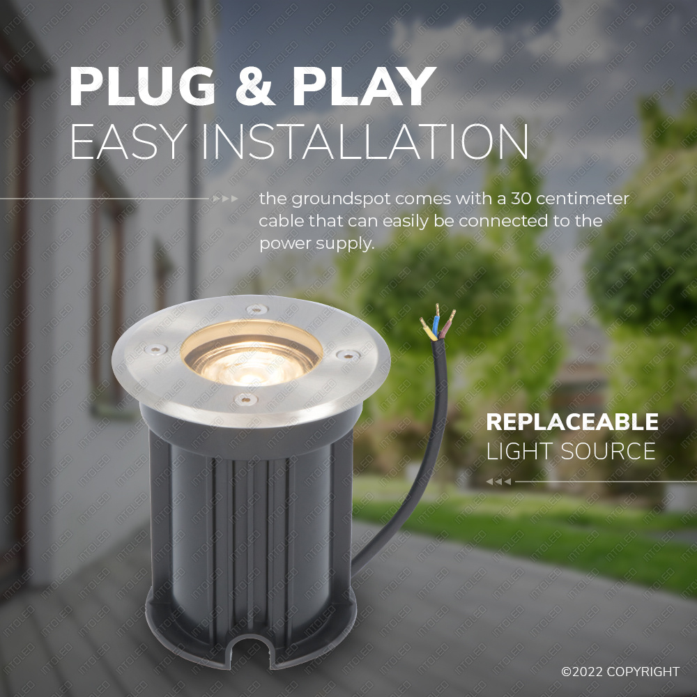 Heb je weinig ervaring met het installeren van verlichting of grondspots? Dan hoef je je geen zorgen te maken: de montage is heel gemakkelijk. De spot is al voorzien van een GU10 fitting en is reeds aangesloten op een kabel van 30 cm lang. De spot zelf heeft een formaat van Ø120xØ90x110mm.