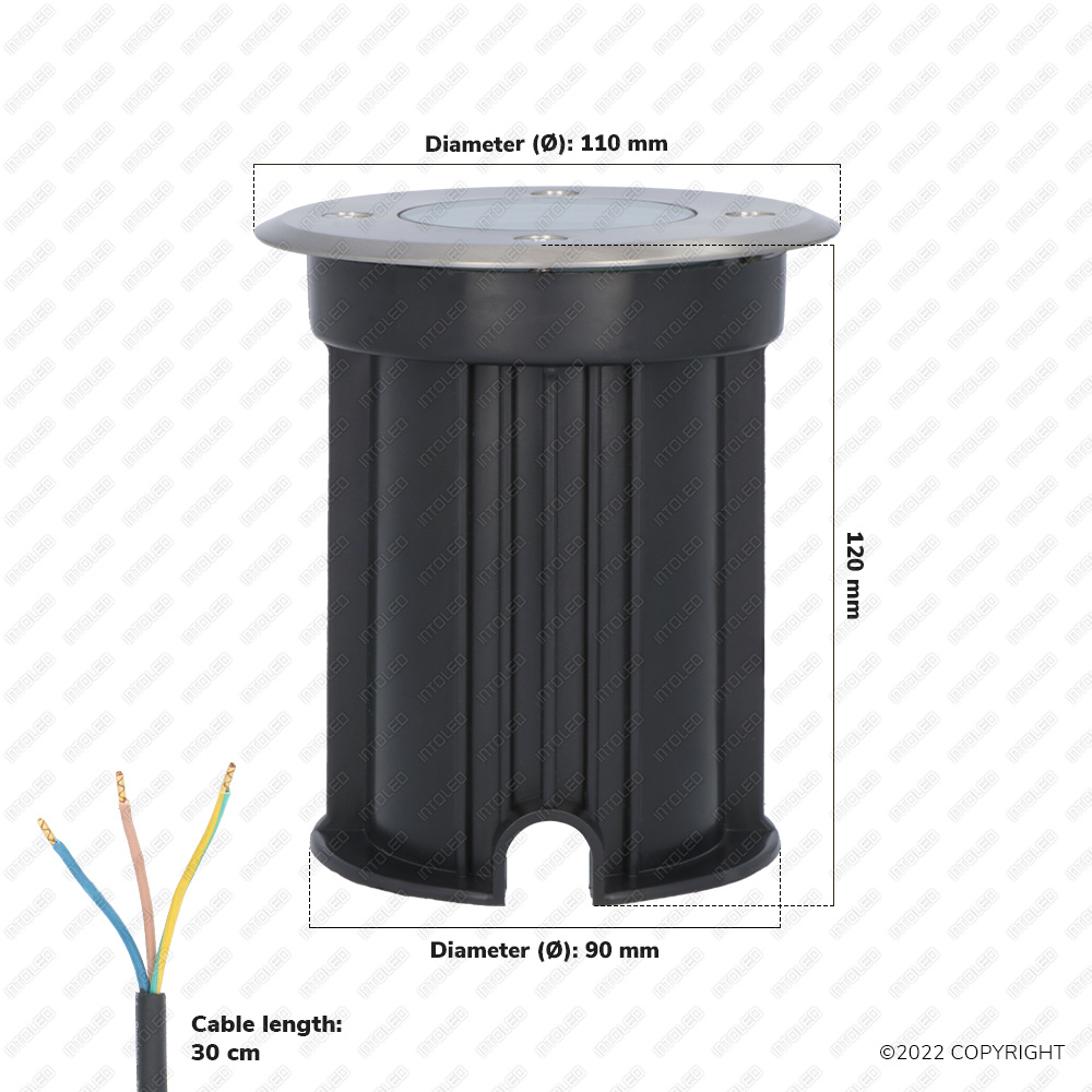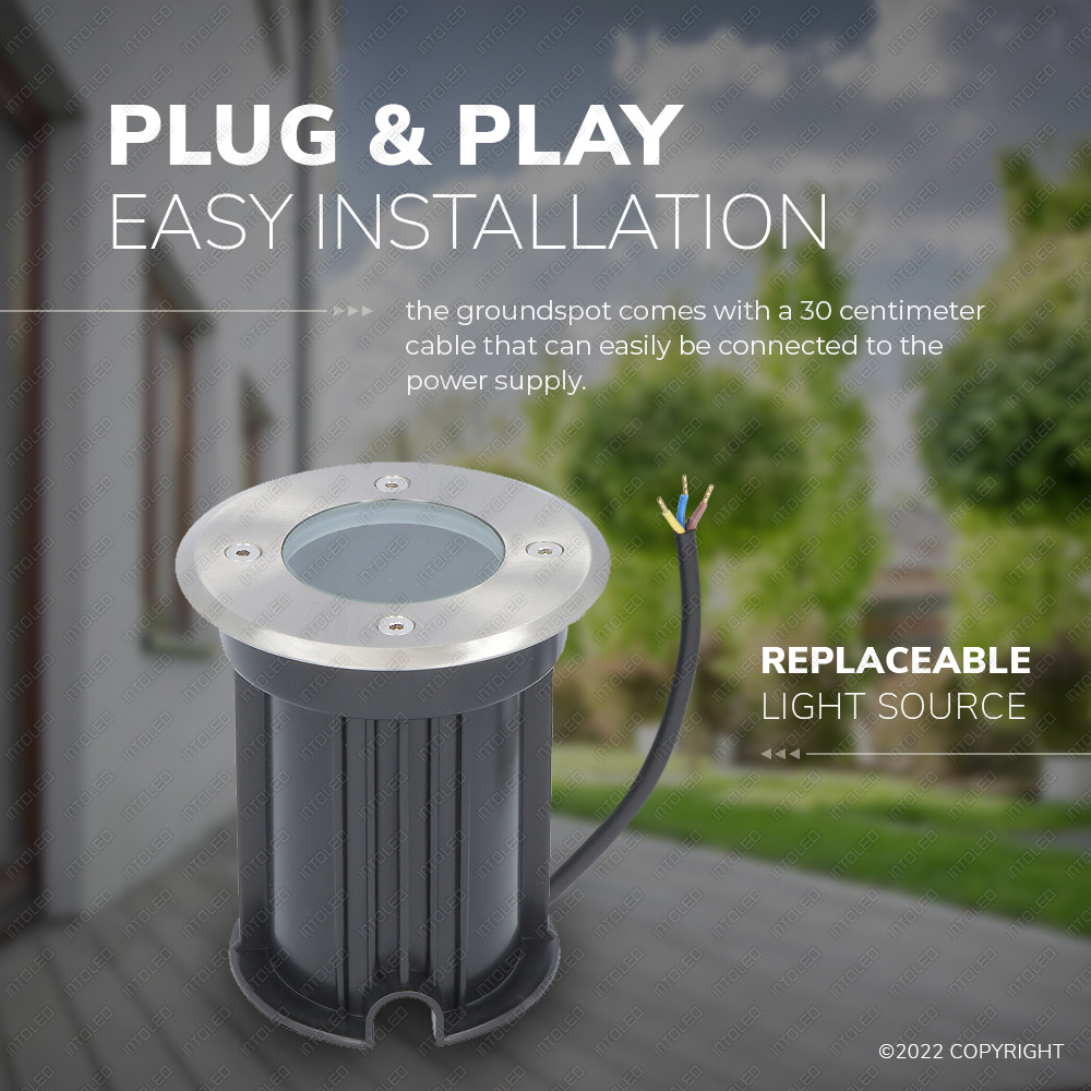 Heb je weinig bedrevenheid met het installeren van verlichting of grondspots? Dan hoef je je geen oppassen te maken: de montage is heel probleemloos. De spot is al voorzien van een GU10 fitting en is reeds aangesloten op een kabel van 30 cm lang. De spot zelf heeft een afmeting van Ø120x110x110mm.