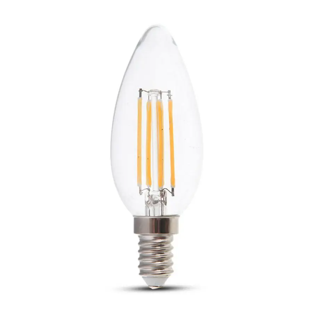 De LED Filament lamp is bruikbaar voor E14 fittingen en heeft een maximaal energieverbruik door een extra laag verbruik van slechts 4 Watt en een extra hoge lichtopbrengst van maar liefst 400 Lumen. Door de gemoedelijke warm witte lichtkleur én de kaarsvorm is deze filament lamp zéér bruikbaar als sfeerverlichting in je woonkamer, eetkamer of keuken.