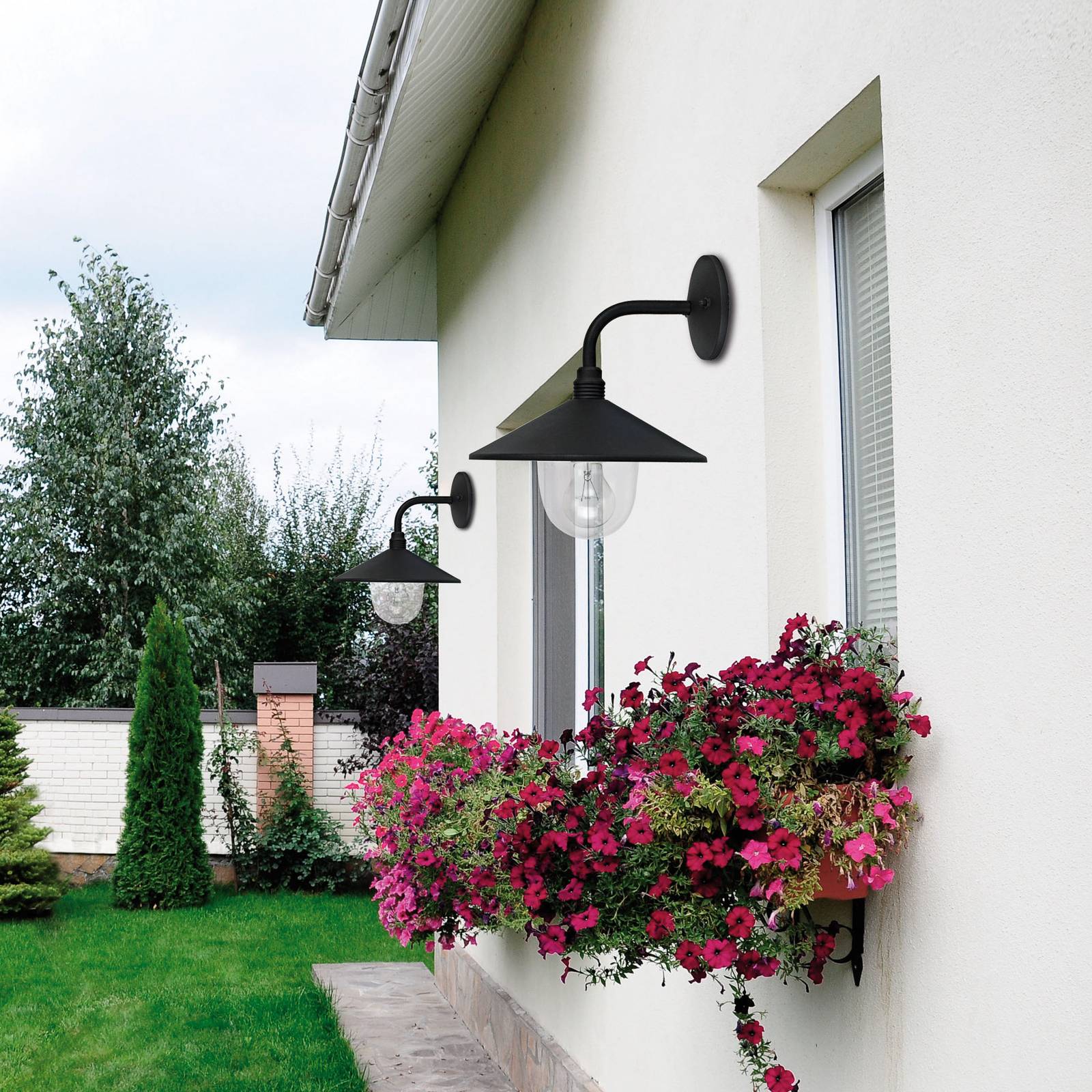 De Pilos buitenwandlamp van duurzaam aluminium met glazen kap biedt rondom helder licht op de gevel, bijvoorbeeld bij de ingang van het huis of op de garagemuur. Beschermd tegen spatwater.
