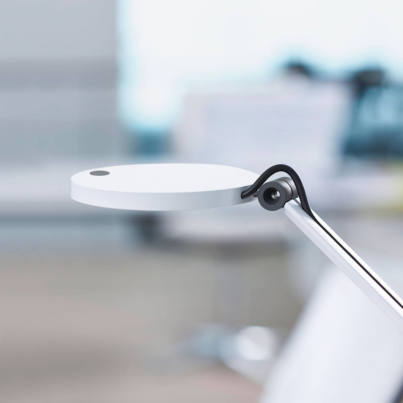 Veelzijdig verstelbare bureaulamp PARA.MI FTL 102 R met grote dubbele arm De PARA.MI FTL 102 R LED tafellamp kan zeer flexibel op het bureau worden geplaatst. De lamp is voorzien van drie scharnieren; aan de voet, tussen de twee delen van de tweedelige arm en aan de beugel van de ronde kop. Deze laatste kan dus worden gedraaid en gezwenkt. De geïntegreerde LED-module garandeert een homogene en brede werkverlichting met een goede kleurweergave. Met de bedieningsknop kan de lichtopbrengst naar behoefte worden aangepast. Geleverd met ronde, kleurgecoördineerde tafelvoet. – Onderhoudsvrije en zelfborgende scharnieren, traploos verstelbaar. – Schakelen en dimmen met memoryfunctie via bedieningsknop in armatuurkop – Inschakelgedrag en automatische uitschakeling instelbaar – Tolerantie kleurplaats (initieel MacAdam): 3 – bekroond met de iF Design Award 2015 en de German Design Award 2016 – Verstelbaar bereik: onderste scharnier 360° draaibaar, 160° naar voren kantelbaar, 75° naar achteren kantelbaar; middelste scharnier totaal 216° kantelbaar; hoofdscharnier 45° draaibaar, 120° kantelbaar aan beide zijden