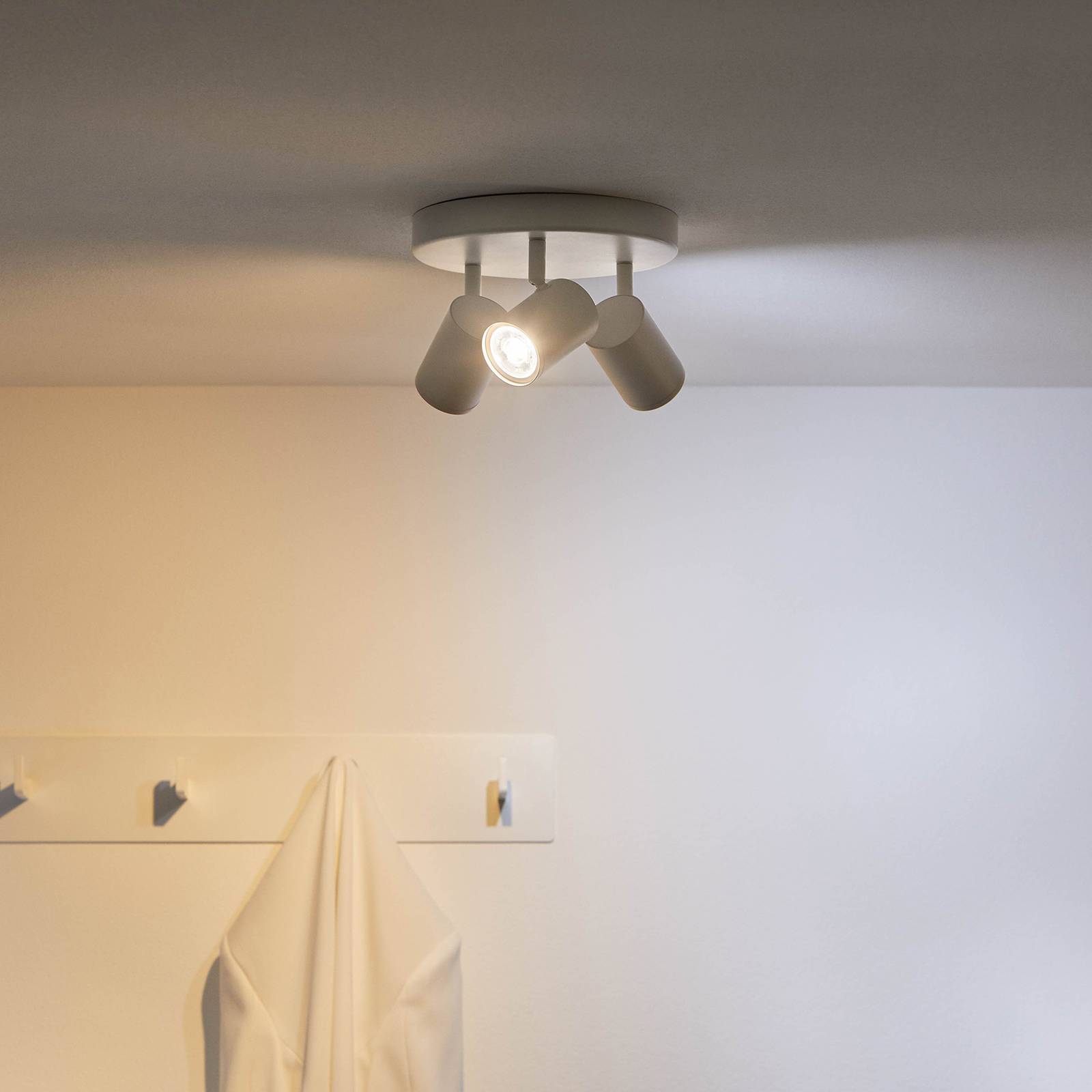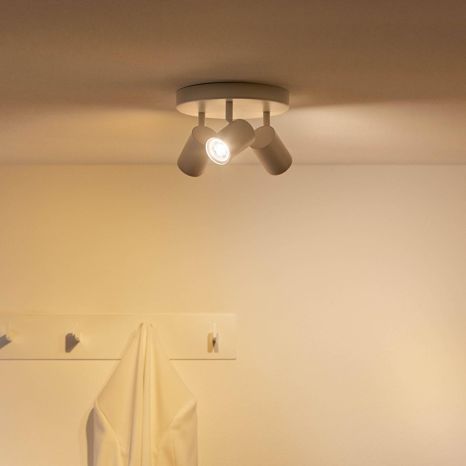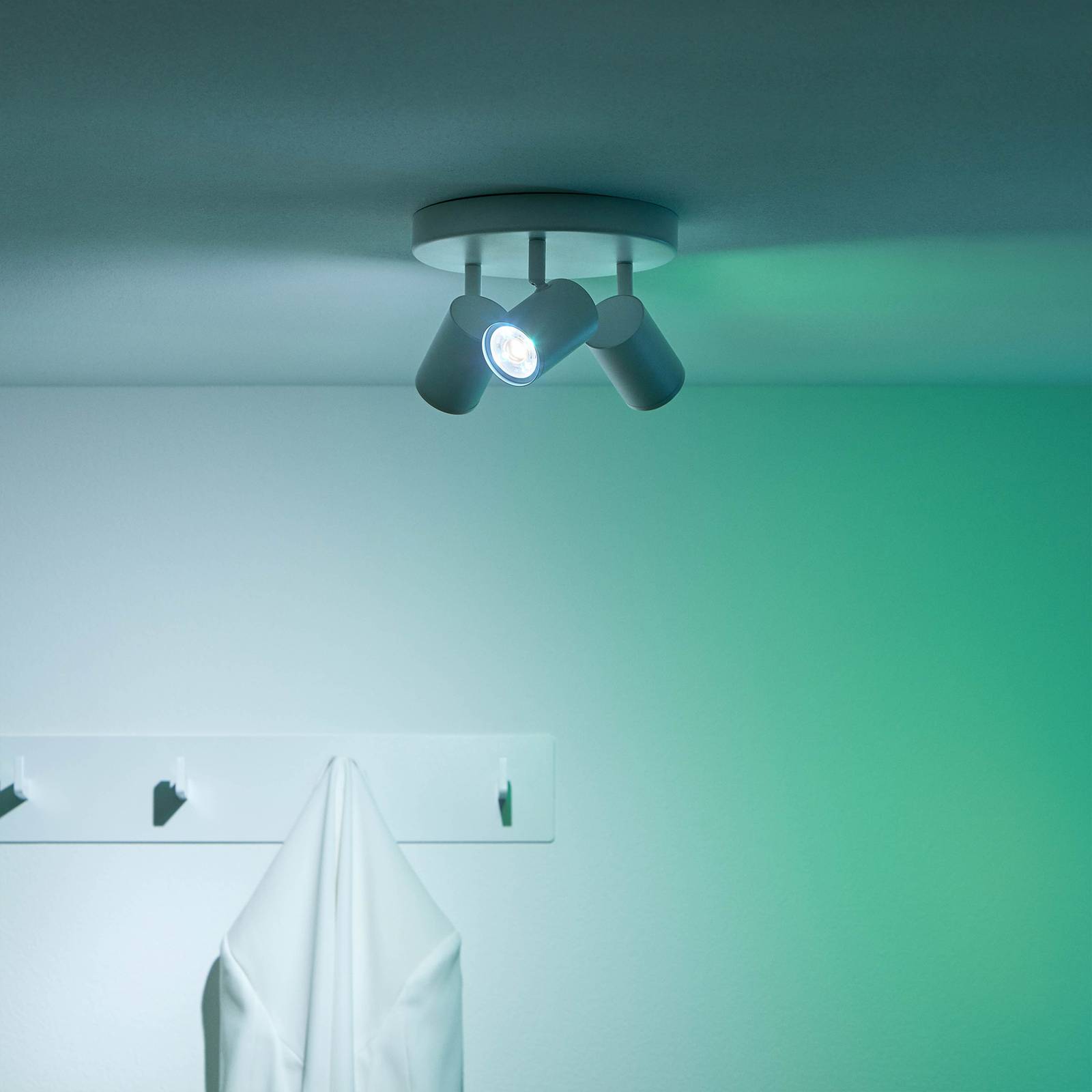 3-lamps Imageo LED plafondspot met app-bediening De LED plafondlamp Imageo biedt een hoge mate van flexibiliteit en verlichting op maat, omdat deze niet alleen is uitgerust met drie verplaatsbare LED spots, maar ook met innovatieve verlichtingstechnologie die eenvoudig kan worden bediend via een app op een tablet of smartphone. Hierdoor kunnen bepaalde delen van de kamer optimaal worden geaccentueerd en ingesteld op verschillende lichtsferen dankzij verschillende lichtmodi of helderheidsniveaus. Afhankelijk van het tijdstip van de dag of de persoonlijke stemming kan er een grote verscheidenheid aan sferen worden gecreëerd. Koel wit of een dynamisch open vuur – met de Imageo plafondlamp kunnen allerlei lichtstemmingen worden gecreëerd. Technische gegevens / compatibiliteit: – Kan worden geïntegreerd via WLAN; bridge of gateway zijn niet nodig – Kan worden bediend met een smartphone of tablet met WiZ app voor iOS (versie 11.0 of hoger) en Android (versie 4.4 of hoger) op locatie of onderweg (internetverbinding vereist) – Meer dan 64..000 witte tinten (Tunable White) en 16 miljoen kleurrijke lichtkleuren kunnen worden ingesteld – App-functies: direct schakelen en dimmen; opslaan van favoriete scènes via cameramomentopname; toewijzen aan kamers/groepen; maken van schema’s; selecteren van vooraf ingestelde lichtmodi/scènes; toewijzen van meerdere gebruikers en toewijzen van toegangsrechten; bedienen van maximaal 10..000 lampen – bedienbaar met WiZ afstandsbediening (zie accessoires) – twee favoriete functies kunnen worden toegewezen aan de conventionele schakelaar via app (WiZclick) – stembediening wanneer geïntegreerd in Google Home, Amazon Alexa (Amazon web services geabonneerd voor de levensduur van de lamp) of Apple HomeKit – integratie in IFTTT voor koppeling met andere slimme apparaten