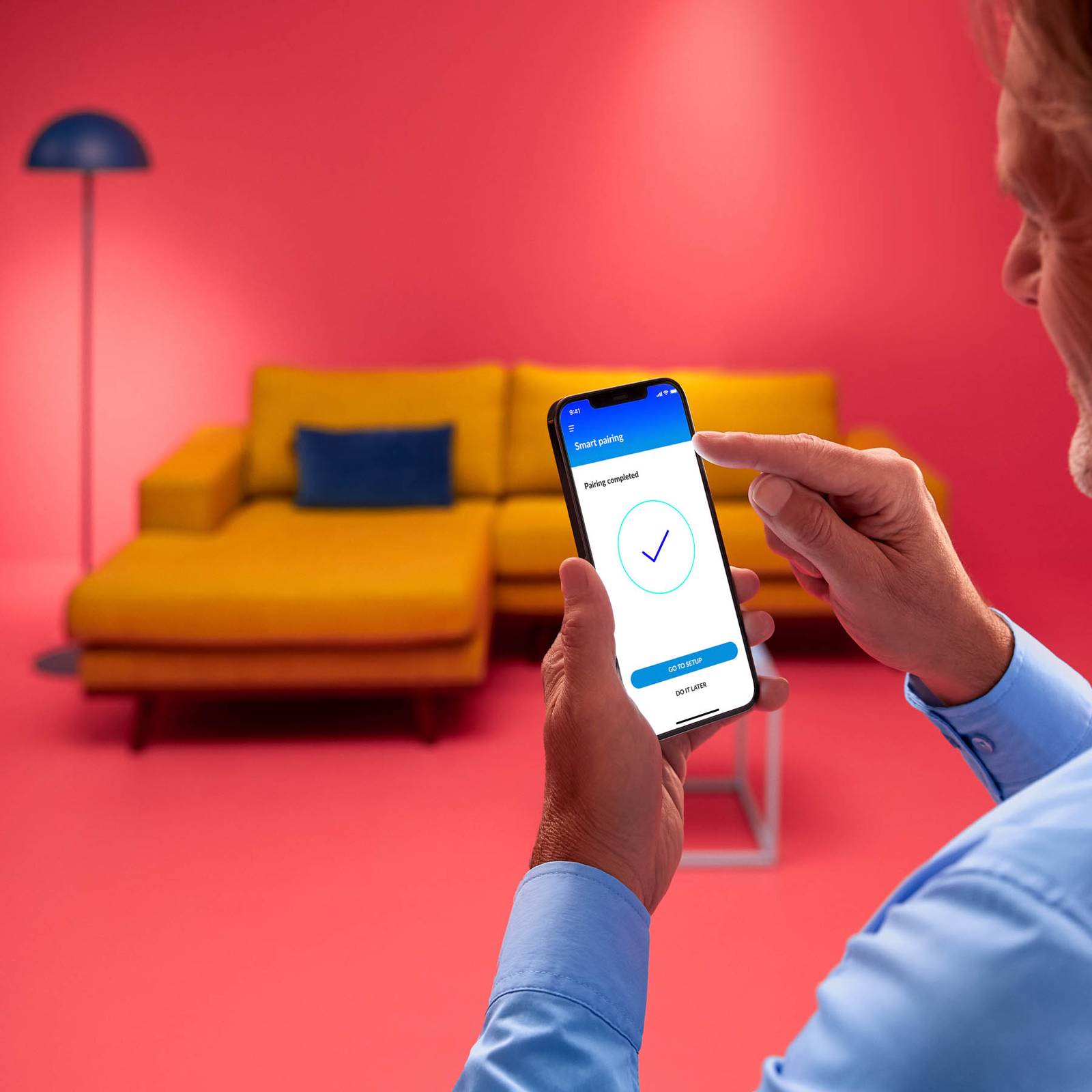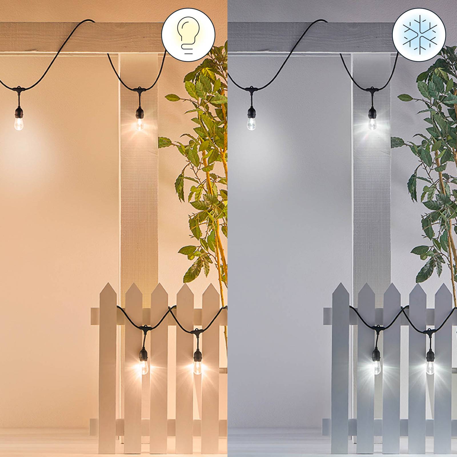 Slimme decoratie voor buiten: String Lights LED lichtketting, IP65/IP44, CCT, RGB De slimme String Lights LED lichtketting van WiZ is stofdicht en beschermd tegen waterstralen dankzij een beschermingsgraad van IP65. Hij is ook UV-bestendig en de netadapter is met beschermingsgraad IP44 beschermd tegen spatwater. Op deze manier is hij ideaal voor buitengebruik en kan hij elk feest individueel verlichten. Dankzij de WiZ-technologie kan de String Lights rechtstreeks in een WLAN-netwerk worden geïntegreerd, zodat er geen extra bridge nodig is. Het licht kan vervolgens worden bediend via de gratis WiZ-app voor Android en iOS, zelfs als je onderweg bent, met je smartphone. Spraakbesturing via Amazon Alexa, Google Assistant of Apple HomeKit (Siri) is ook mogelijk, en de String Lights LED lichtketting kan niet alleen aan- en uitgezet worden, maar ook traploos gedimd worden: De lichttemperatuur kan ook traploos worden aangepast van warmwit (2.700 Kelvin) tot universeel wit (5.000 Kelvin). Daarnaast zijn er ook miljoenen lichtkleuren beschikbaar dankzij de RGB-functie. Verschillende lichtscènes kunnen ook vooraf worden ingesteld via de WiZ app. Als alternatief kan de WiZ afstandsbediening, die apart verkrijgbaar is als accessoire en ook zonder Wi-Fi werkt, worden gebruikt om de lamp aan en uit te zetten, te dimmen en maximaal vier vooraf ingestelde lichtscènes op te roepen. LED lampen en netadapter zijn al geïntegreerd, zodat de WiZ String Lights meteen kunnen worden gebruikt. Speciale kenmerken / compatibiliteit: – Meer dan 16 miljoen kleuren en instelbaar van warmwit tot universeel wit – Traploos dimbaar – Kan worden geïntegreerd via WLAN; bridge of gateway zijn niet nodig – Kan worden bediend met een smartphone of tablet met WiZ afstandsbediening (zie accessoires) – Spraakbediening met Amazon Alexa, Apple HomeKit (Siri) of Google Assistant mogelijk – App functies: direct schakelen en dimmen; opslaan van favoriete scènes via cameramomentopname; toewijzen van lampen aan kamers/groepen; aanmaken van schema’s; selectie van vooraf ingestelde lichtmodi/scènes; toewijzen van meerdere gebruikers en toewijzen van toegangsrechten.